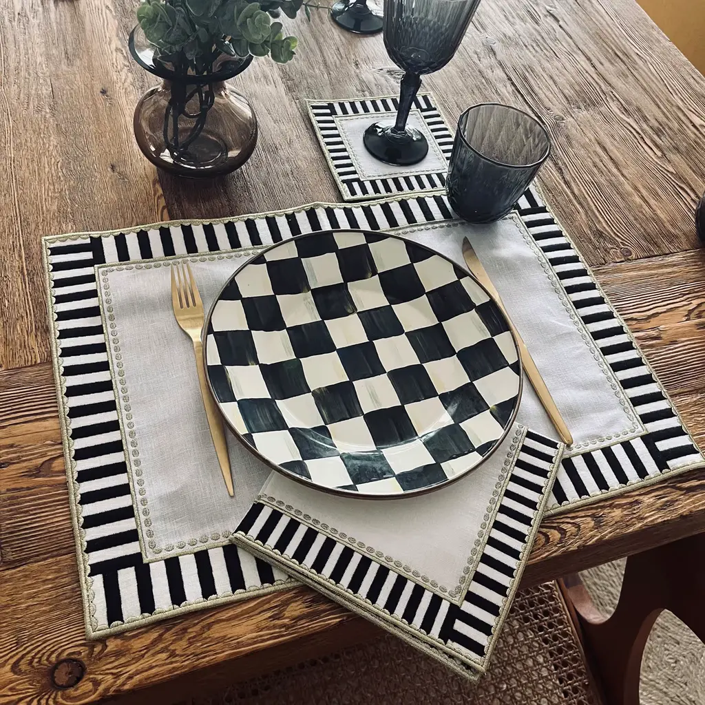 Elevate your dining experience with these 100% linen cloth napkins, finished with elegant gold cording for a modern yet timeless touch. Designed to perfectly complement black and white tableware, they bring both sophistication and charm to your table setting. Ideal for formal dinners, casual gatherings, or festive occasions. Size: 16'' x 16'' (40x40 cm). Available in sets of 2 Matching cocktail napkins and placemats also available to complete the look.