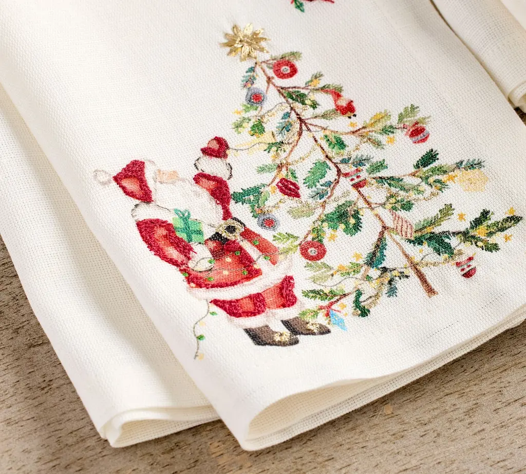 Inspired by holidays spent in the countryside, these cotton-linen napkins depict Santa decorating the tree with cheer. Each napkin has a different scene, bringing the set to life. Pair them with the rest of the collection for a truly magical table setting.
