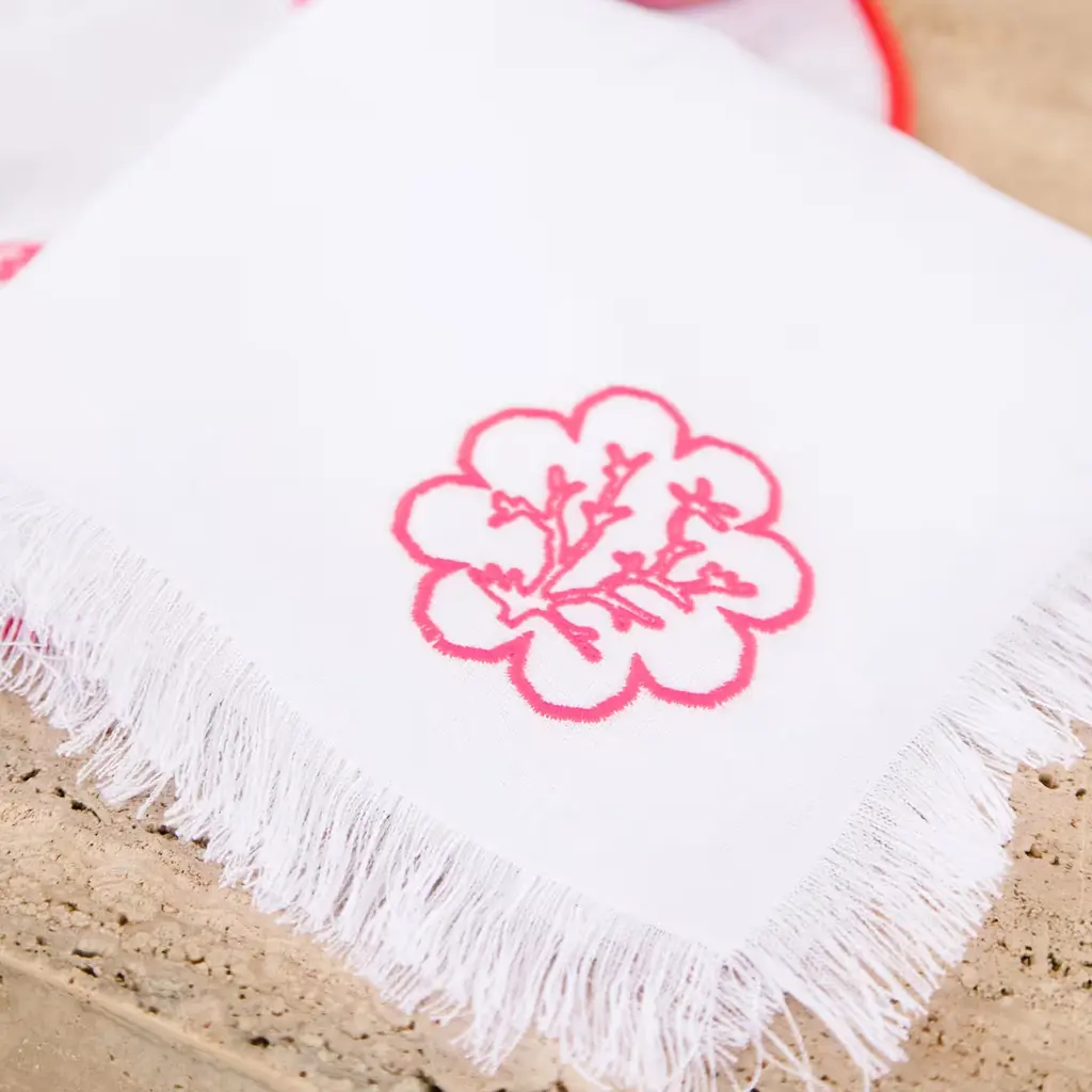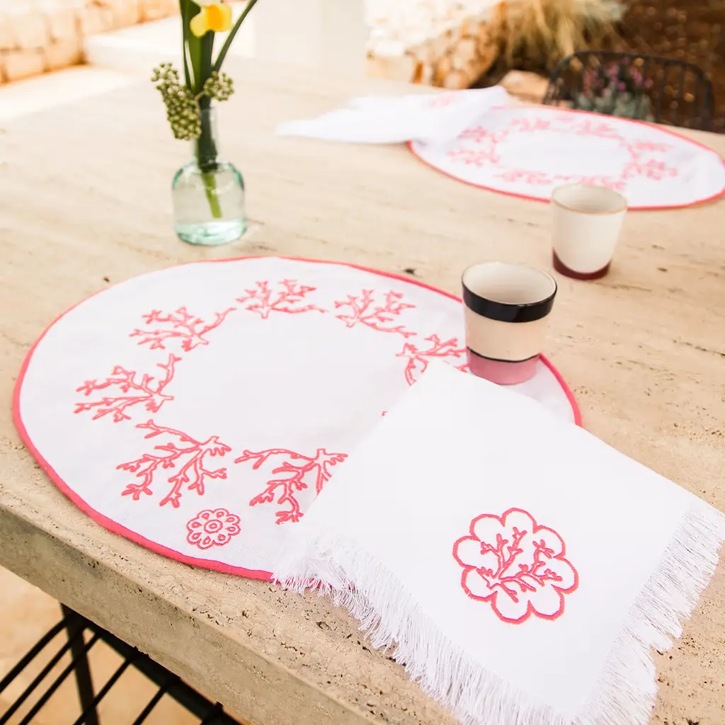 Fresh and precious in its Masters of Linen certified weft, this set of six napkins conveys its romantic charm through the dainty Mako cotton embroidery of a pink coral in the corner. Fringed profiles further enliven its aesthetic, whose exclusivity is implied by the minute process of manual embroidering behind every piece. Please consult the Concierge for checking the color variants' availability.