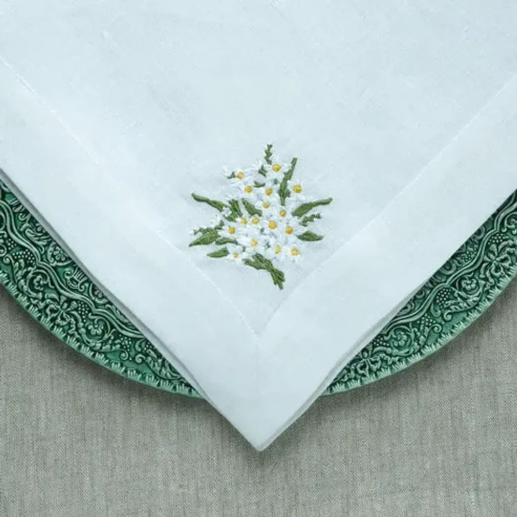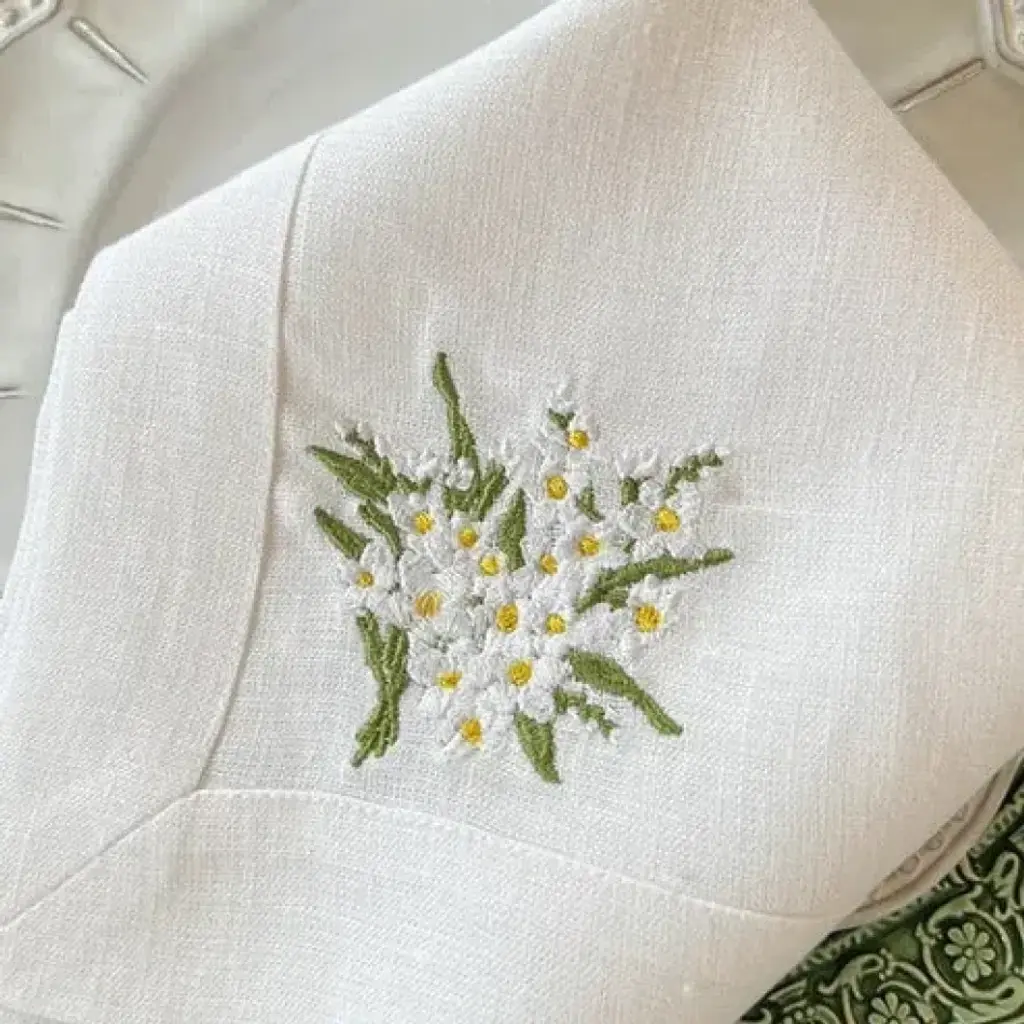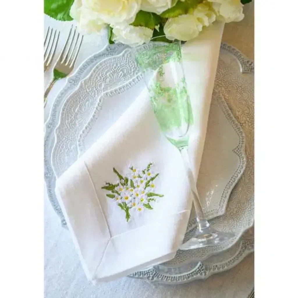 Crown Linen Designs 100% European linen napkins are a perfect mix of elegance and beauty. Combine with a runner, table topper or placemats to finish off the look. Each napkin is embroidered with a "Daisy Bouquet" on one side corner.