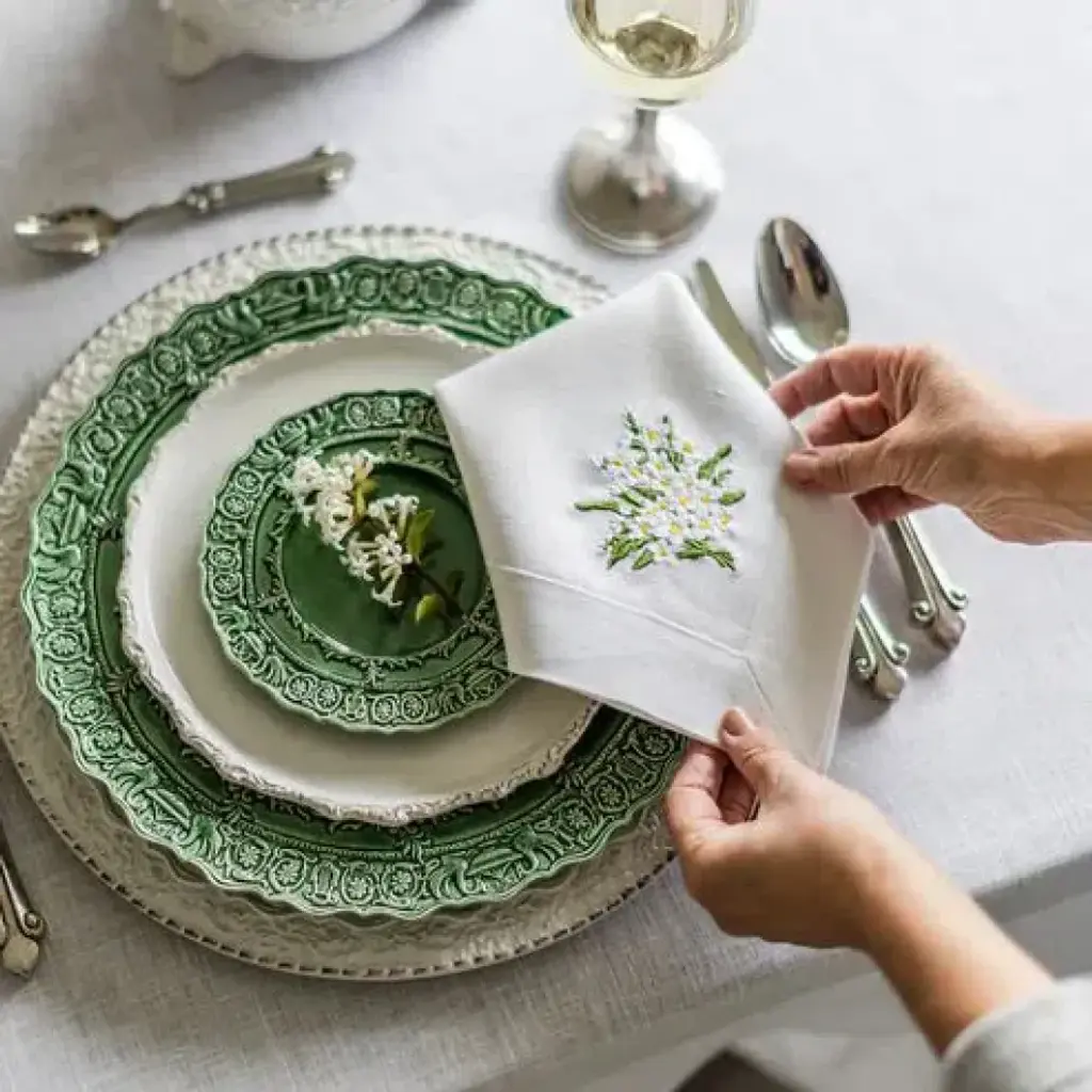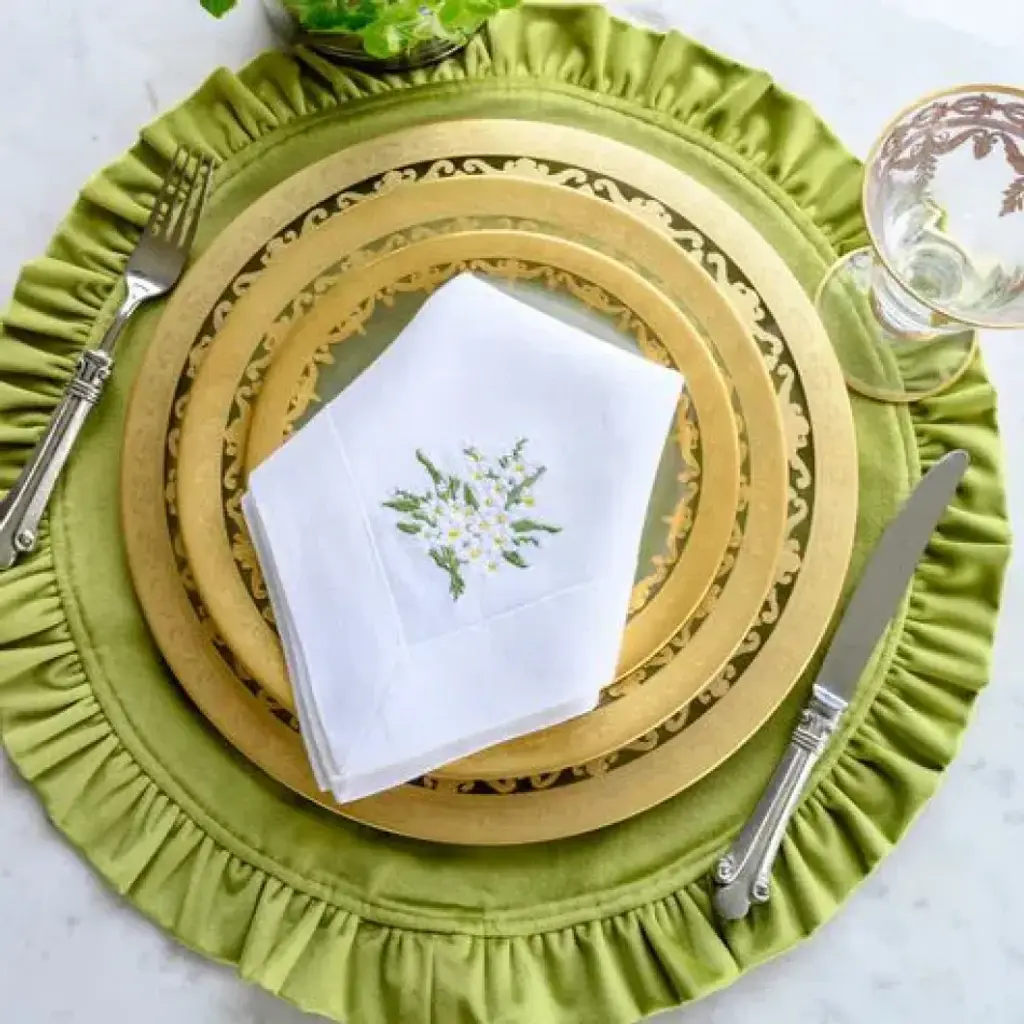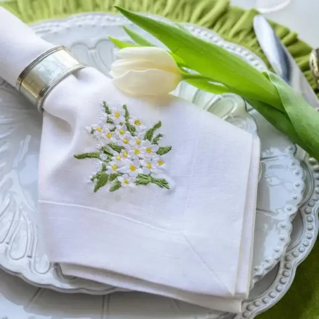 Crown Linen Designs 100% European linen napkins are a perfect mix of elegance and beauty. Combine with a runner, table topper or placemats to finish off the look. Each napkin is embroidered with a "Daisy Bouquet" on one side corner.