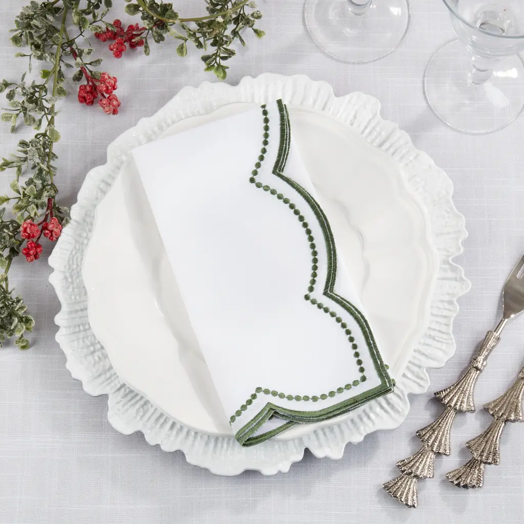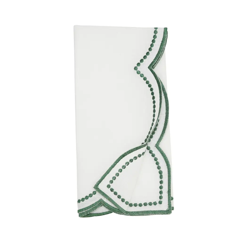Elevate your dining experience with the exquisite Embroidered Polka Dot Napkins featuring a charming scallop edge. Delicately crafted, each napkin is adorned with intricate embroidery, adding a touch of timeless elegance to any table setting. The playful polka dot pattern infuses whimsy into your gatherings, while the scalloped edges exude sophistication. Perfect for both casual brunches and formal dinners, these napkins are sure to impress your guests and elevate any occasion. Make every meal a special one with the Embroidered Polka Dot Napkins.