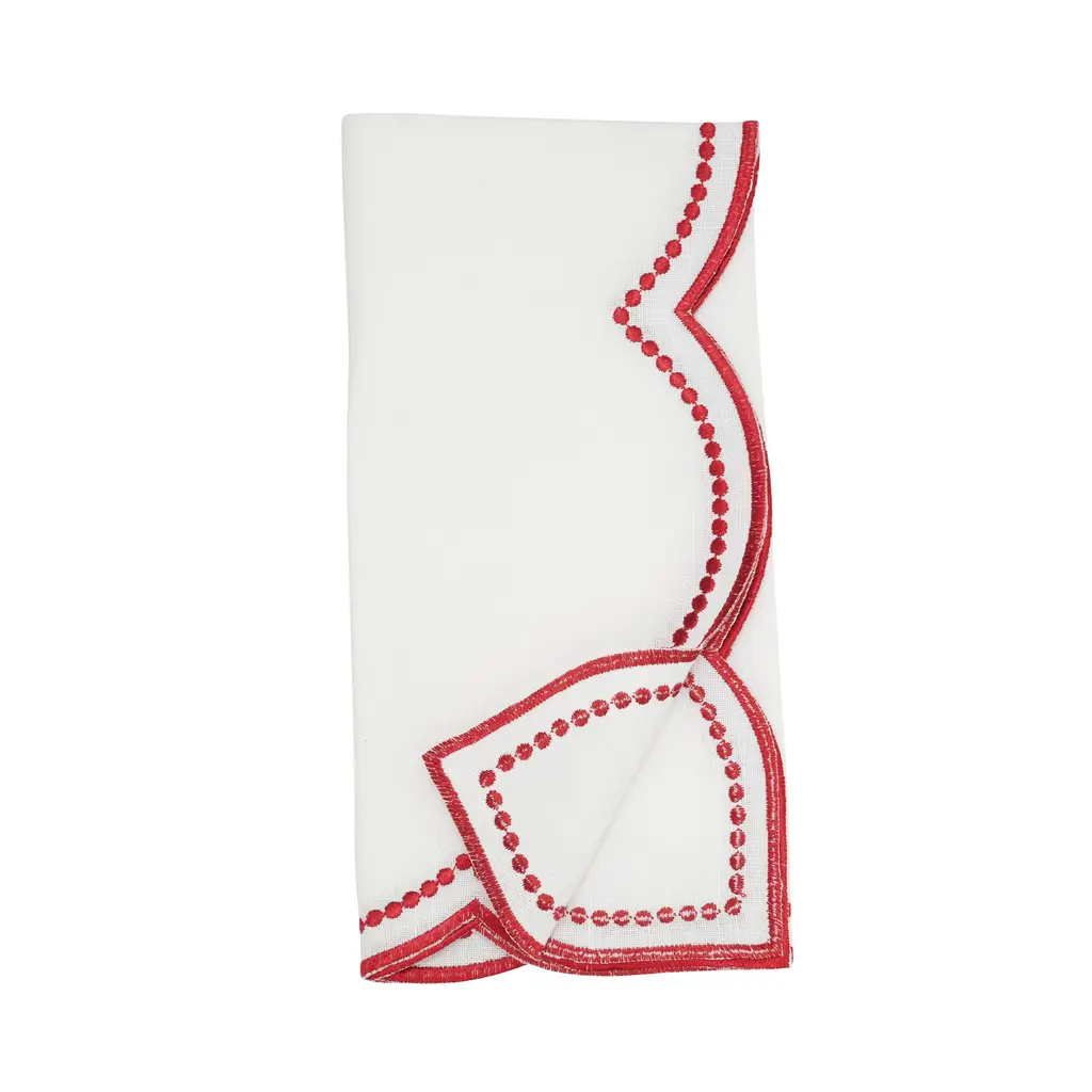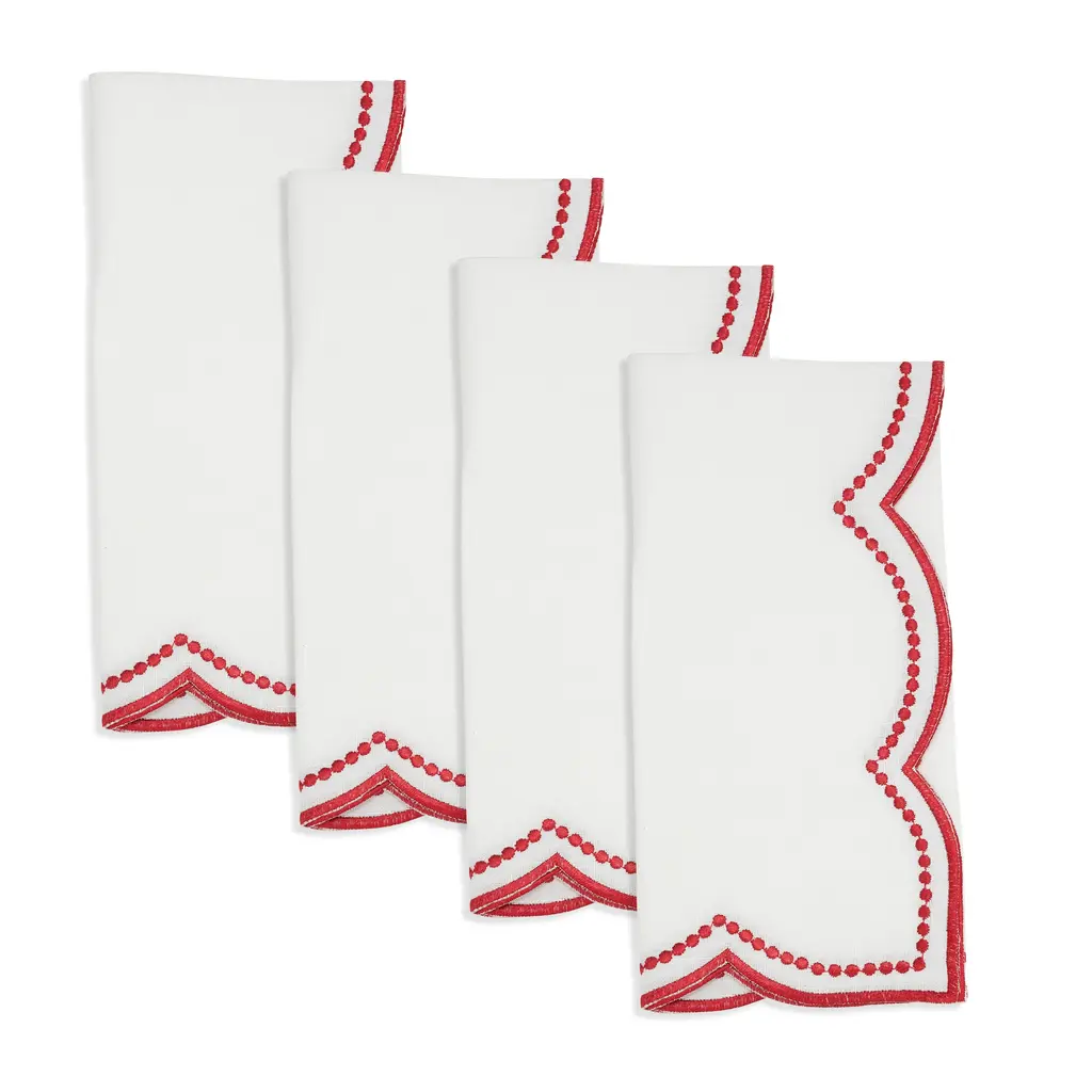 Embroidered Polka Dot Napkin W/ Scallop Edge, Set Of 4 - Red