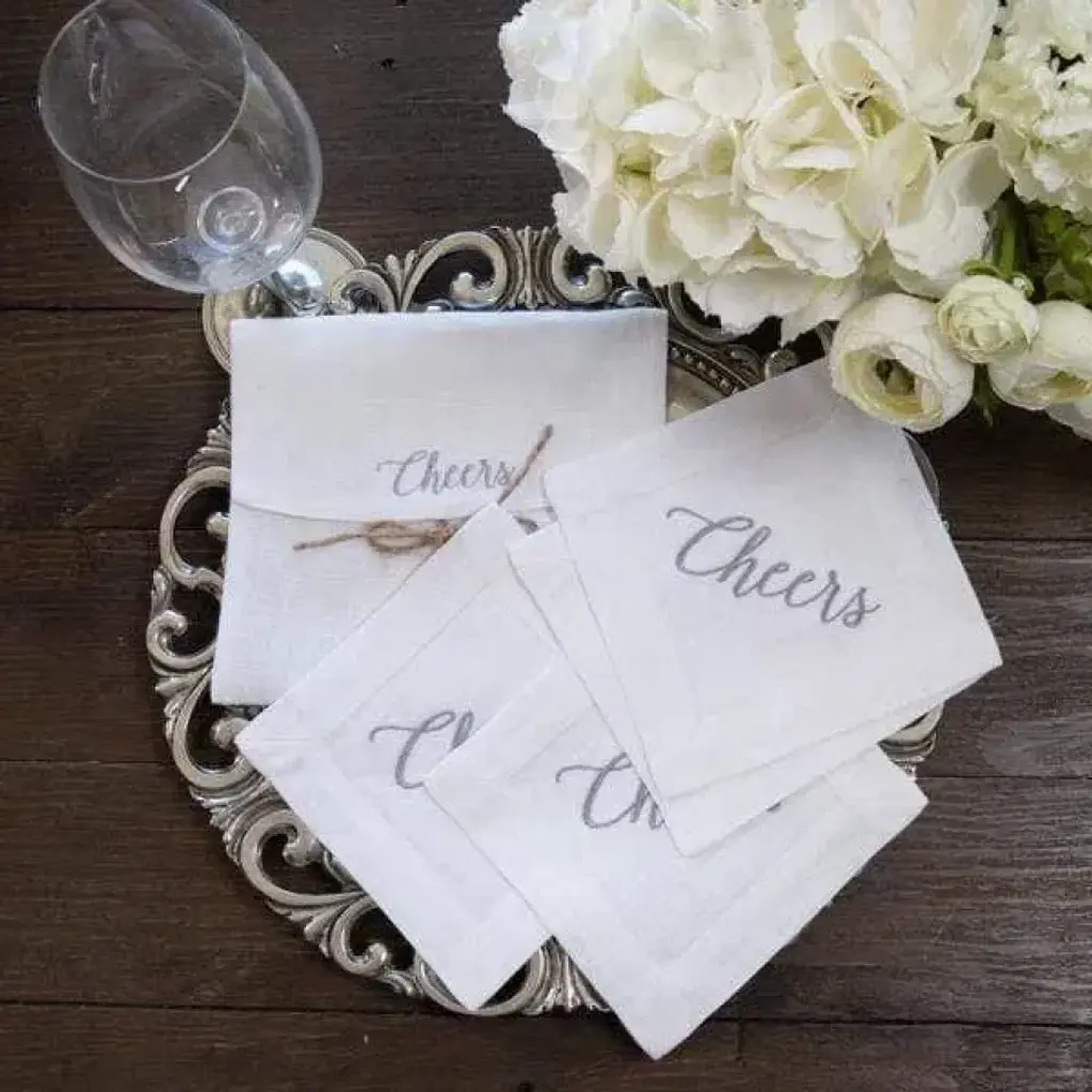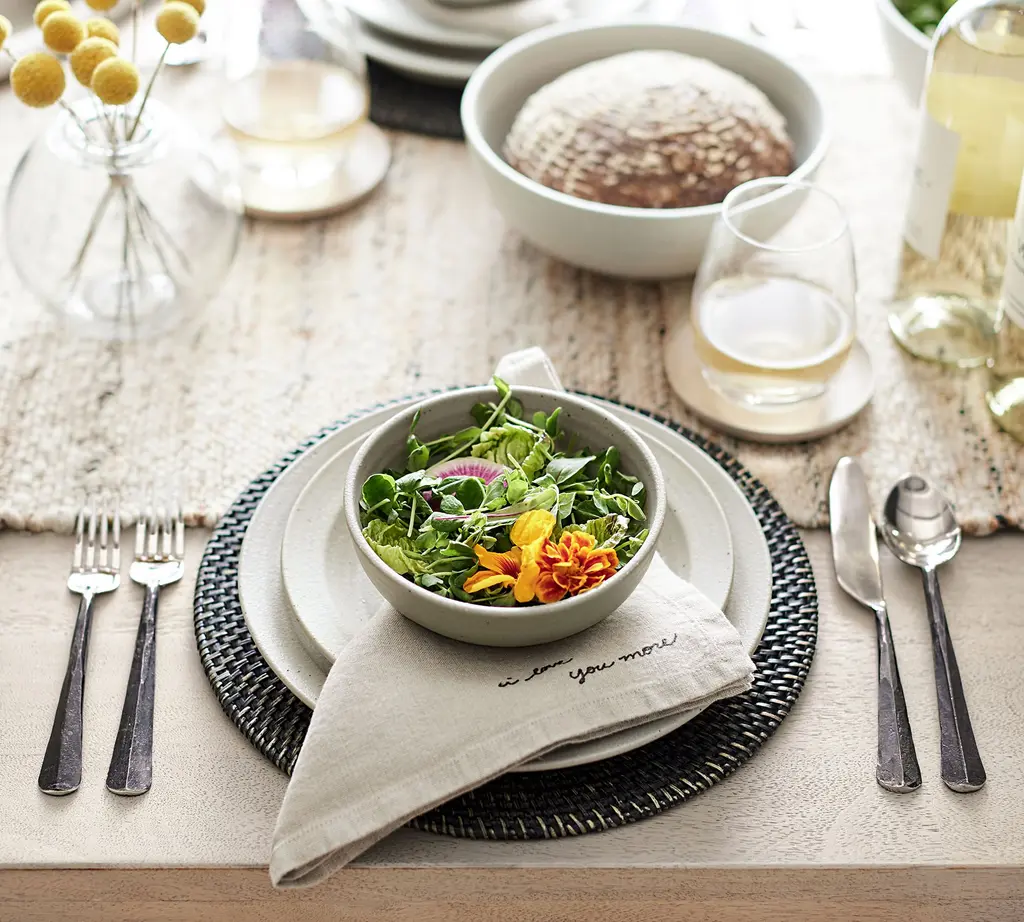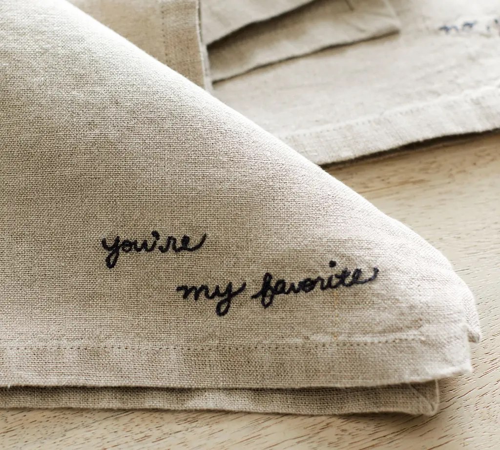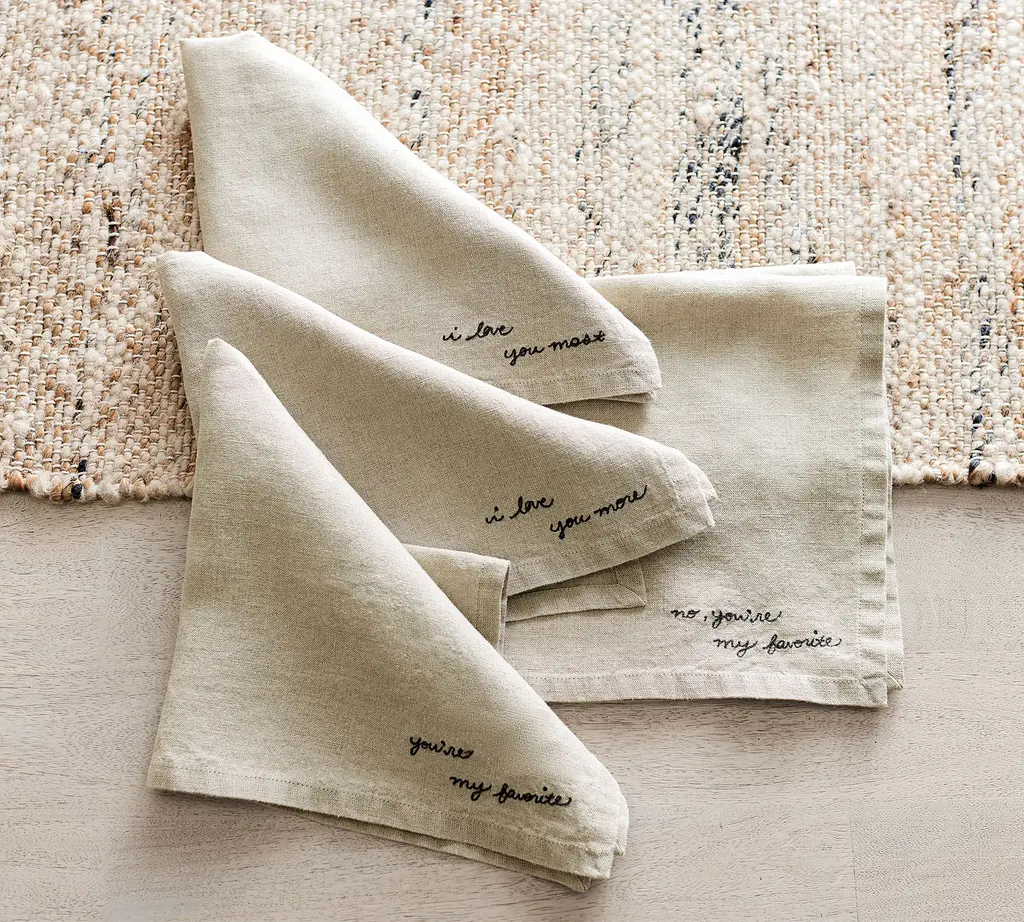 Sweet sayings embroidered on this set of napkins remind us to enjoy life’s little moments. Handwoven of linen for a relaxed, cozy look, they continue to get softer with time and add a romantic accent to any meal.