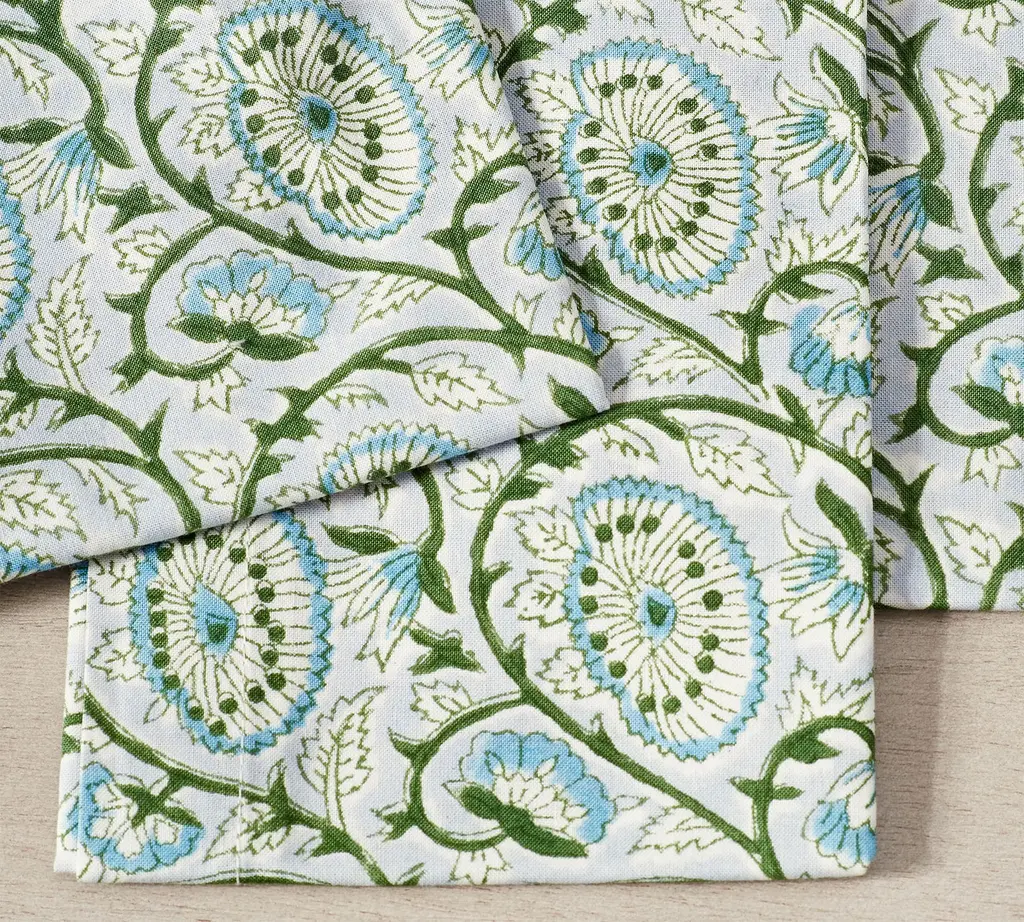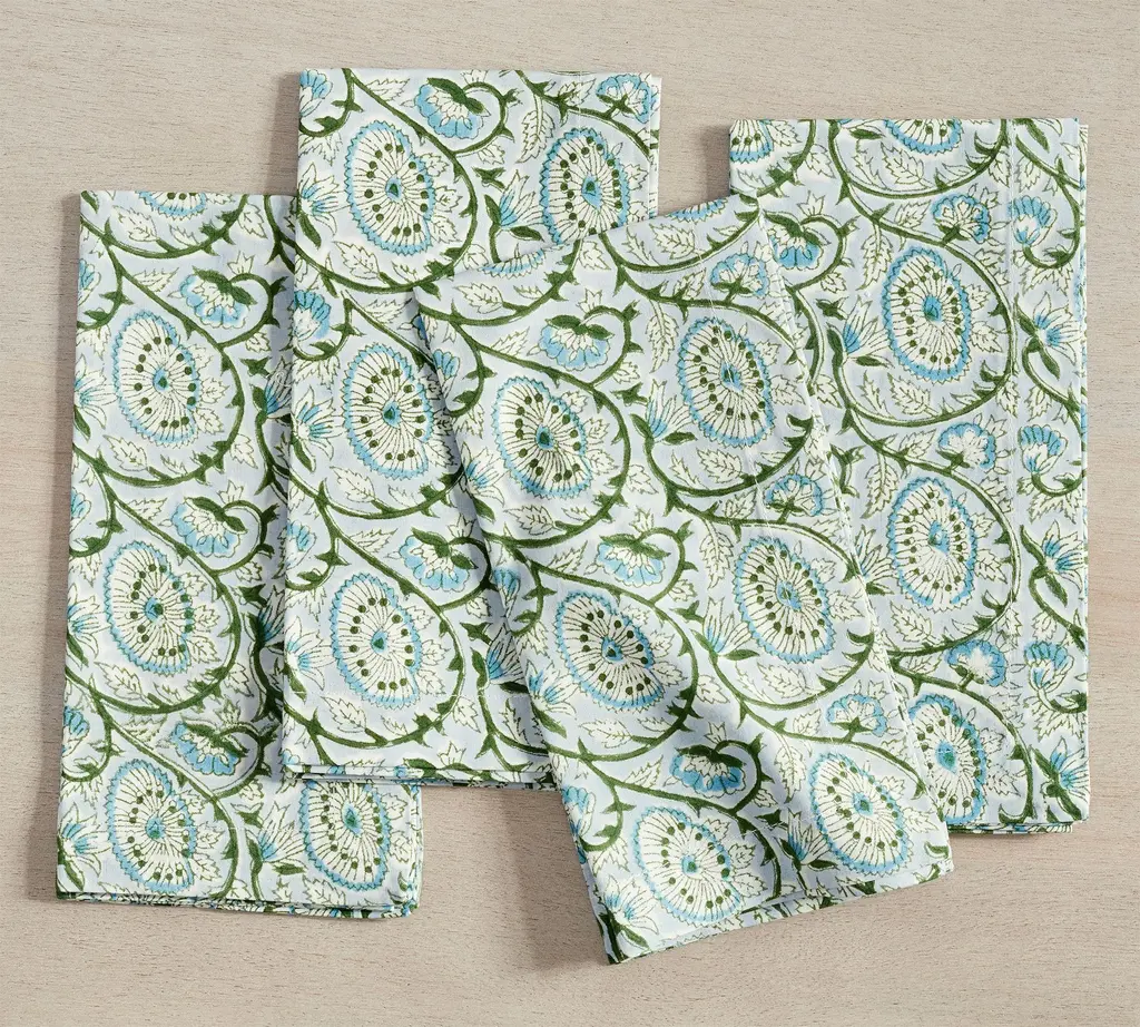 Block-printed by hand in India, our 100% cotton napkins elevate the everyday by brightening up your tabletop. The swirling green vines of this entertaining essential layer beautifully, simply place atop simple serveware to let the pattern pop.