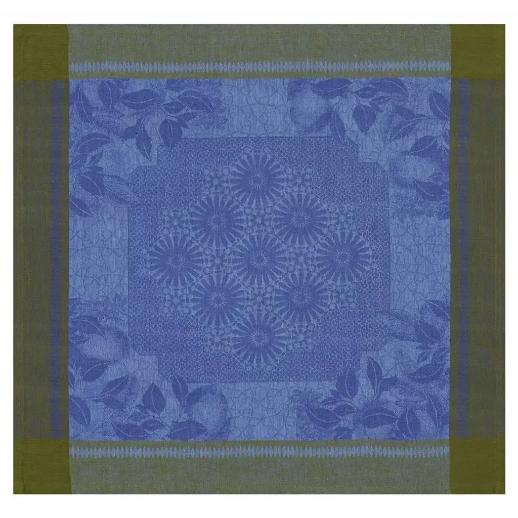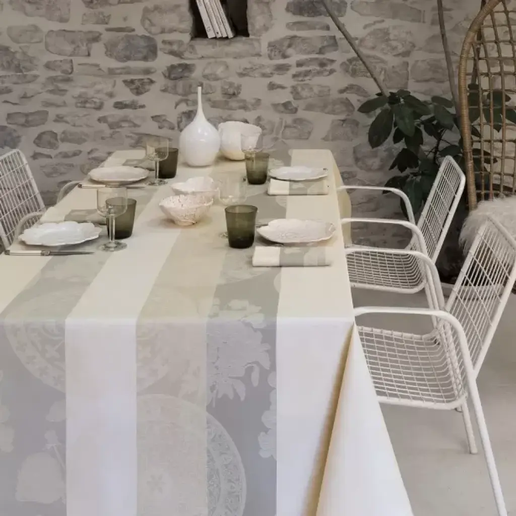 This floral theme weaves together stripes of forget-me-not, peach, and green apple for a mouth-watering summer look. Make a splash at your next garden party! Since 1888, Le Jacquard Francais has created a collection of table linens without equal. Weavers, warp beamers, knotters and other specialists work in harmony to perfect the weaves and colors of all of their linens. Classic Le Jacquard Francais linens are characterized by using framed woven patterns to create timeless tablecloths, napkins, placemats and table runners that will beautify your tables for many years. Le Jacquard Francais coated tablecloths are made of 100% cotton weave with long fibers. They are waterproof and stain-resistant thanks to a patented and exclusive acrylic coating that withstands washing. Newly introduced, LJF by Le Jacquard Francais is a more casual line of contemporary looks that mixes colors and patterns and plays with graphics. Practical and easy to use, these tablecloths will stand up to frequent use in the kitchen or patio.