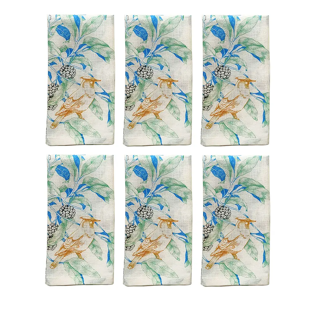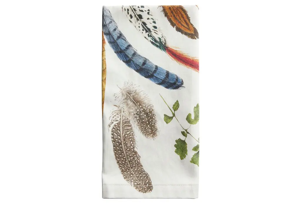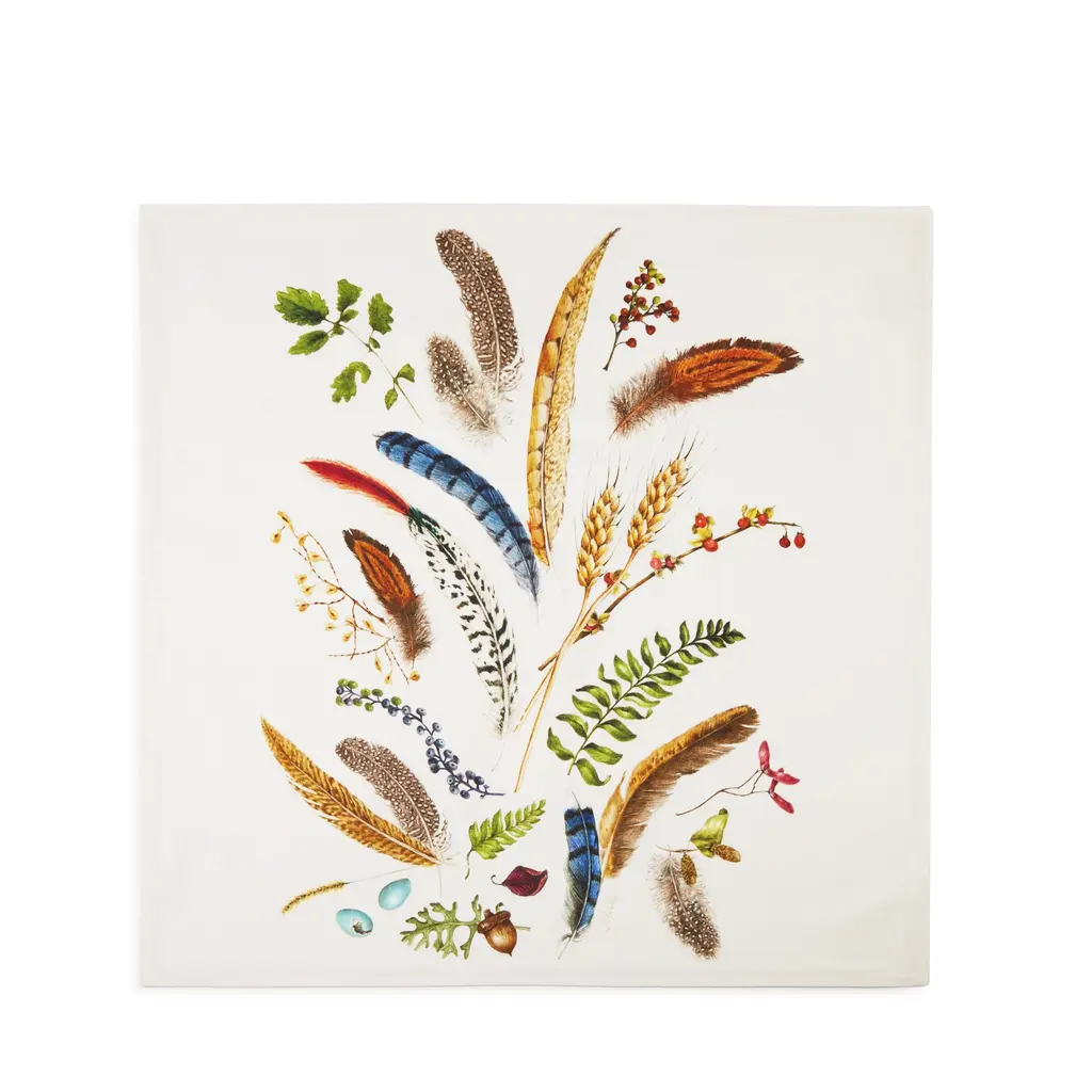 An artful display of woodland treasures, this napkin celebrates many colors and textures of nature.
