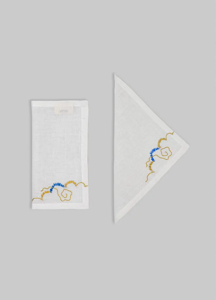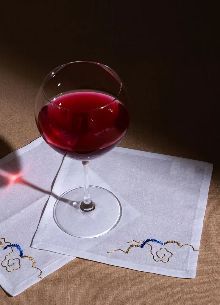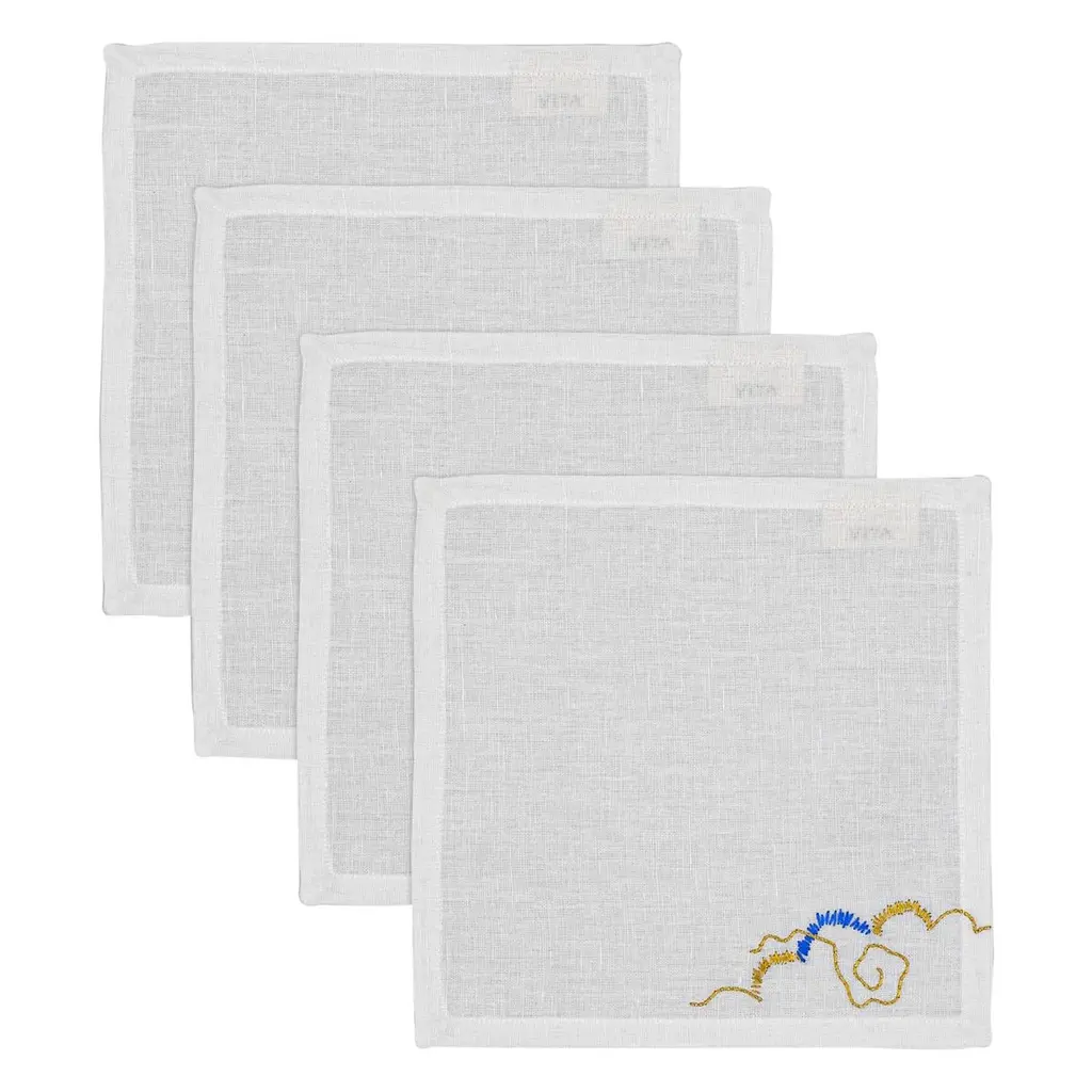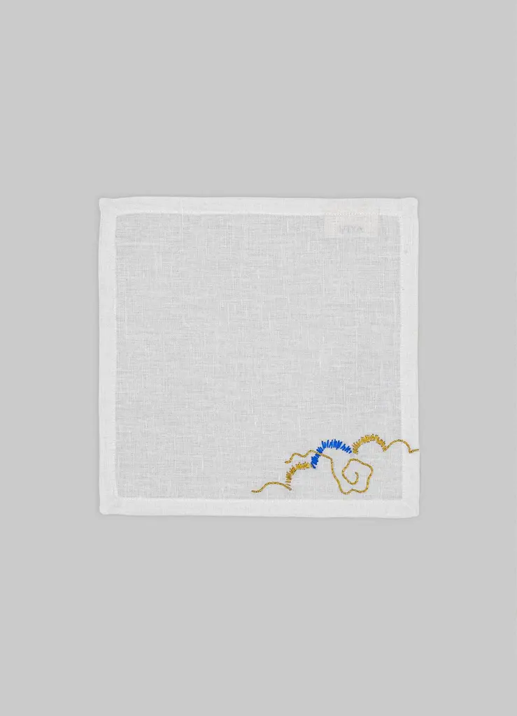 Gajasimha Hand Embroidered White & Gold Cocktail Napkins Set of 4The Gajasimha, a mythical cross between lion and elephant, isn't just impressive looking. This guardian of ancient Indian art embodies the best of both worlds: the lion's regal strength and the elephant's wise dignity. Our collection inspired by this mythical guardian from the 17th century Indian manuscript, “The Book of Dreams”, attracts not just protection, but the combined blessings of the lion's ambition and the elephant's wisdom, manifesting both wealth and a discerning mind to use it well.Hand embroidered cocktail napkins in cotton linen. Handmade in India.Product DetailsMaterial: Cotton LinenSize: 8''W x 8''L 20.3 W x 20.3 L cmWeight: 0.03 0.066 lbsNumber of Pieces: 4 Cocktail NapkinsSKU: VCN451This product has been handcrafted by local artisans. As such, slight variations are a testament to the unique character of a piece made by hand.Country of Origin: India