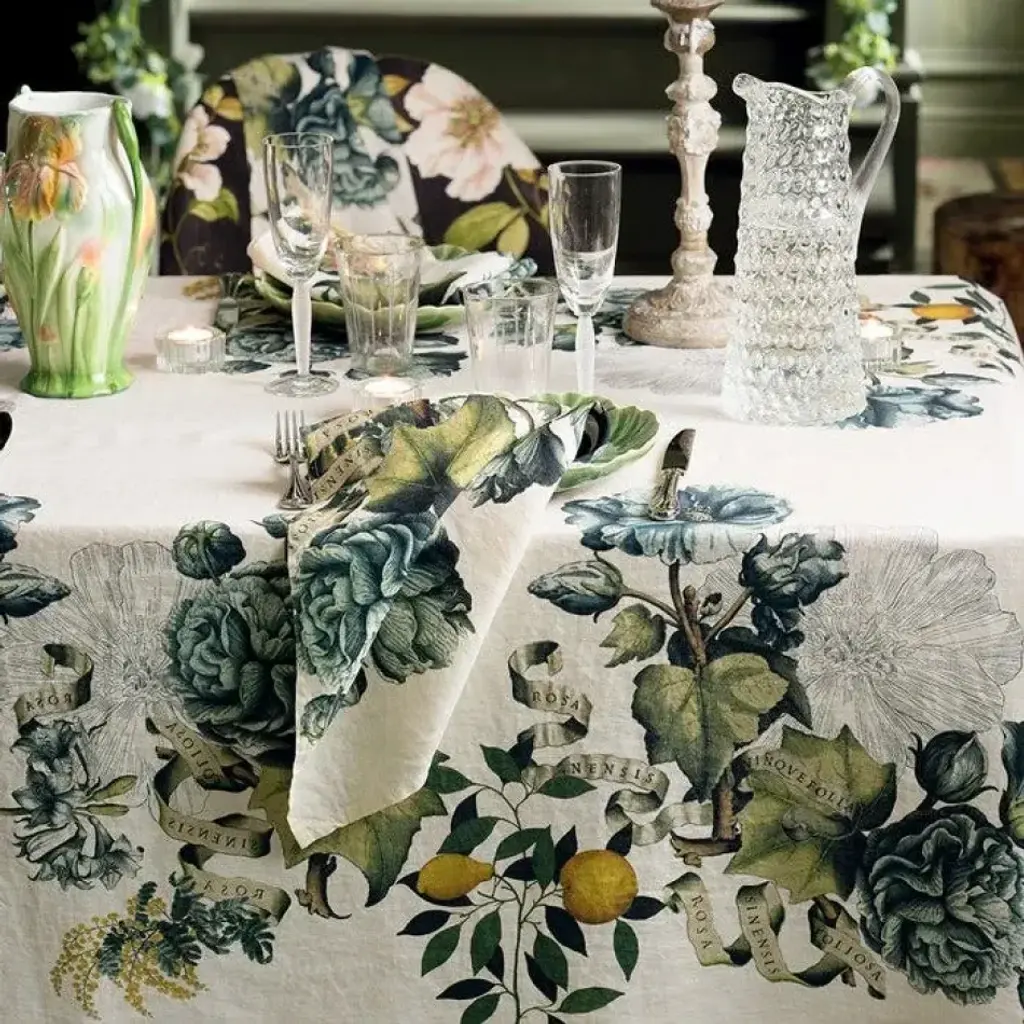 The Giardino Naturel Printed Tablecloth features an Italian garden-scape of rich blue florals, green ivy, and yellow lemon tree branches, stretching across an off-white base of cotton-linen blend fabric. This printed design was crafted from original artwork, hand-drawn by our in-house team of textile artisans & designers in France. Subtle in texture, our pure linen table collections boast a light and airy organic wrinkled appearance, and do not require ironing for easy-maintenance. Perfect for every season's table settings, enjoy rustic Italian garden views in both indoor and outdoor dining settings. by the gardens of Italy which is perfect for any outdoor party this summer. Since 1870, Garnier-Thiebaut has created classic and jacquard linens in the quintessential French style. Their linens have been used by the Four Seasons George V in Paris, the Mandarin Oriental Hotel in Geneva, The Ritz Carlton, Manama (Bahrain), Le Meridien Bora Bora, the Four Seasons Hotel, New York, and The French Laundry in Yountville.