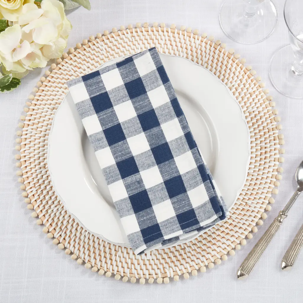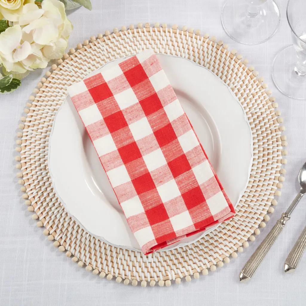 The Gingham Design Cotton Napkins set brings a classic touch to your tabletop. They are a perfect choice for everyday use, but can also be used for picnics, brunches and other occasions. Ideally paired with red runner and charger plates.