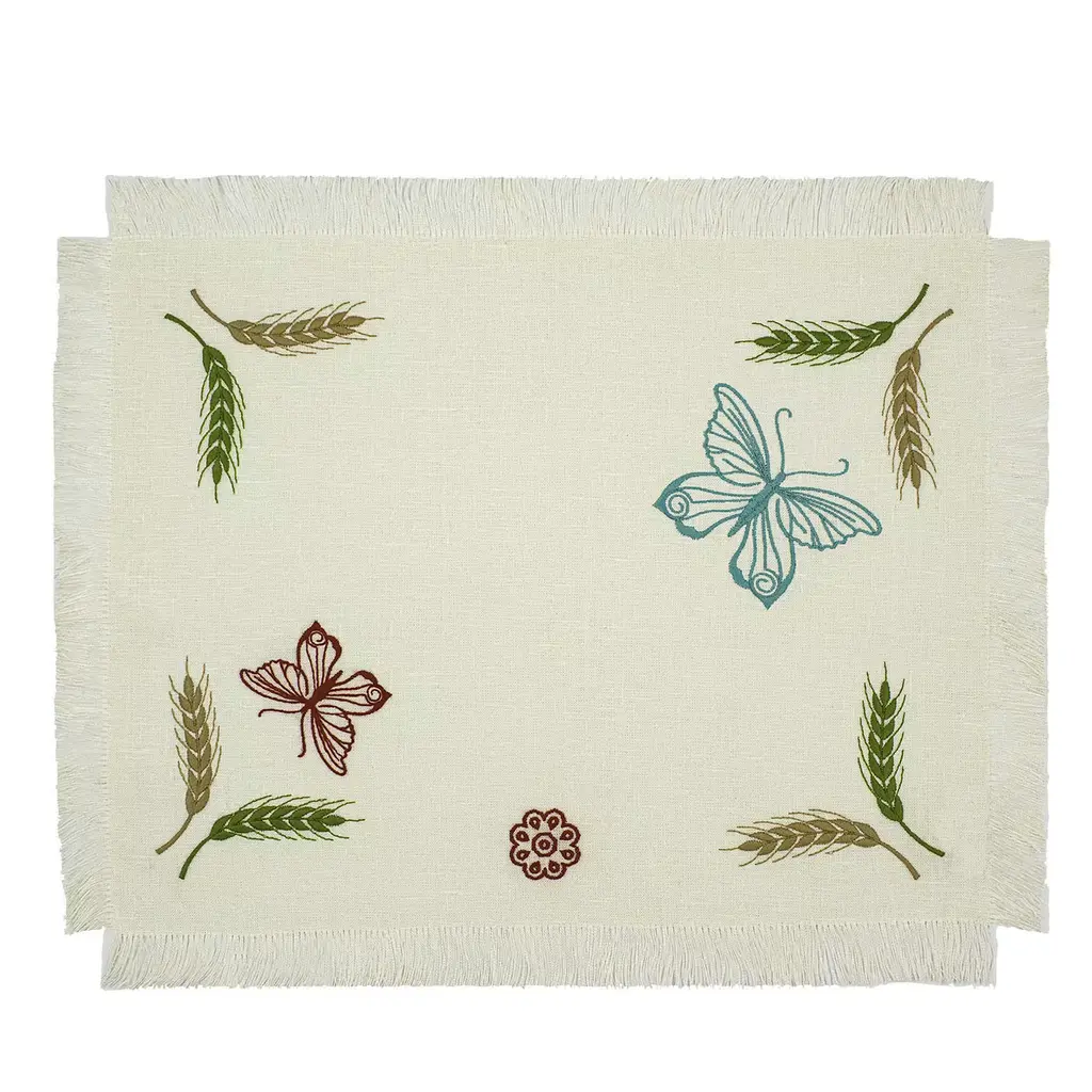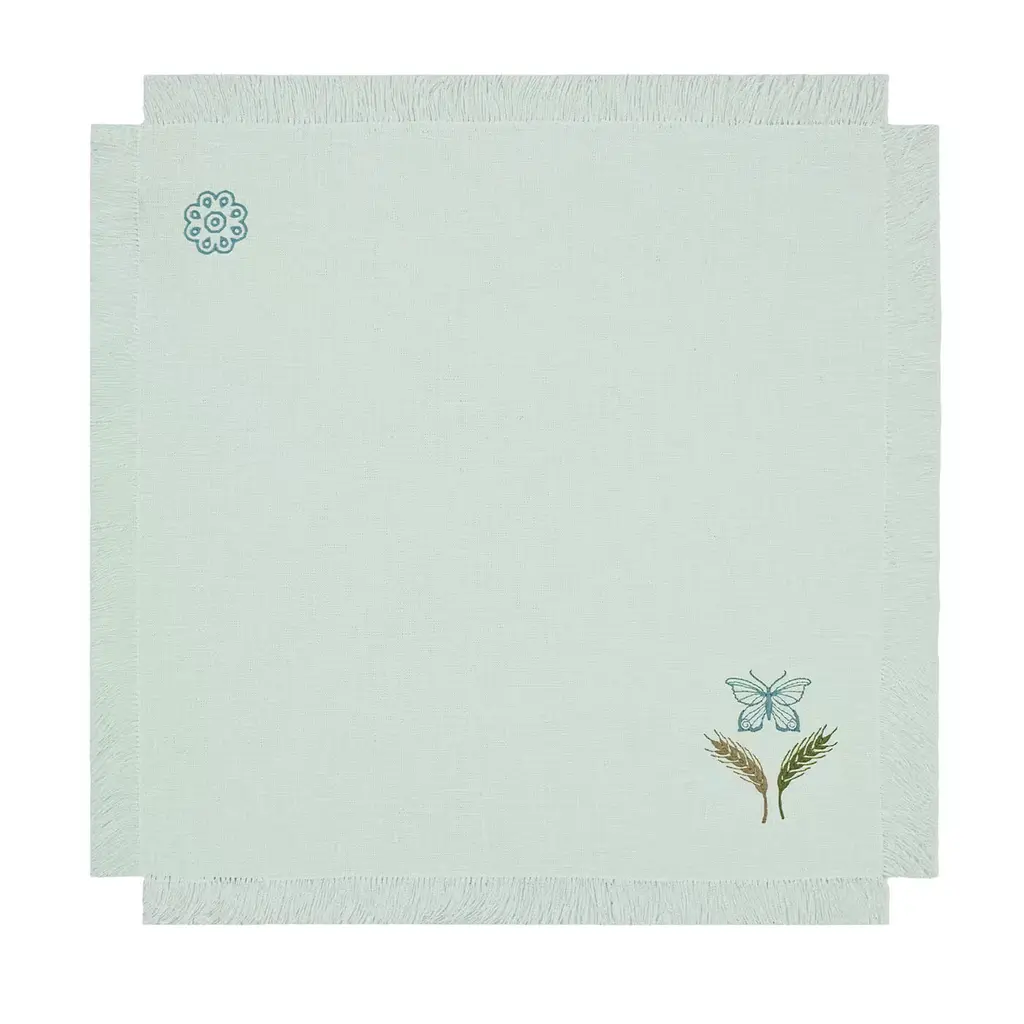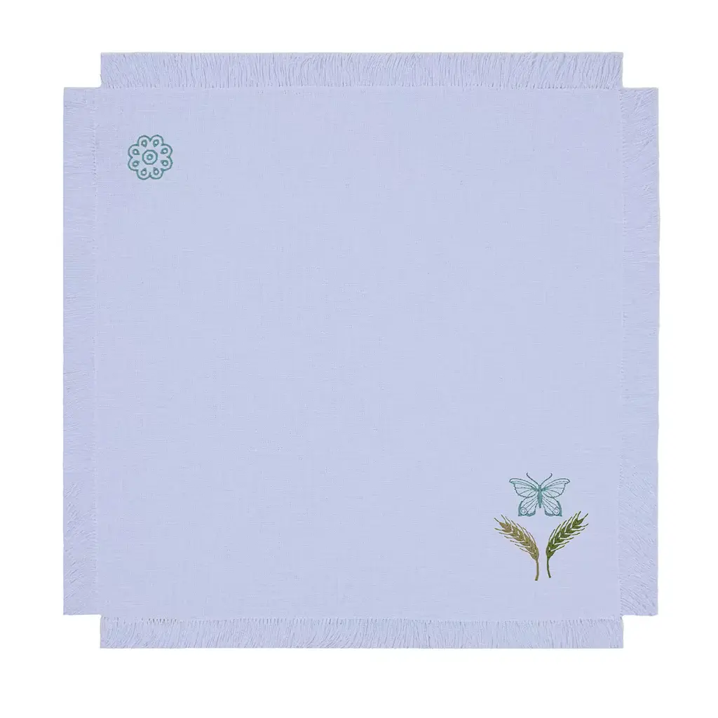 Multiple hours of deft manual embroidering are behind the six napkins making up this artisan set in Masters of Linen-certified ivory linen. Marked by fringed profiles, they flaunt a stylized flower and a delicate combination of a butterfly atop two heads of grain. Romantic and unique, the set is also available in more color variants to be explored in the Artemest catalog.