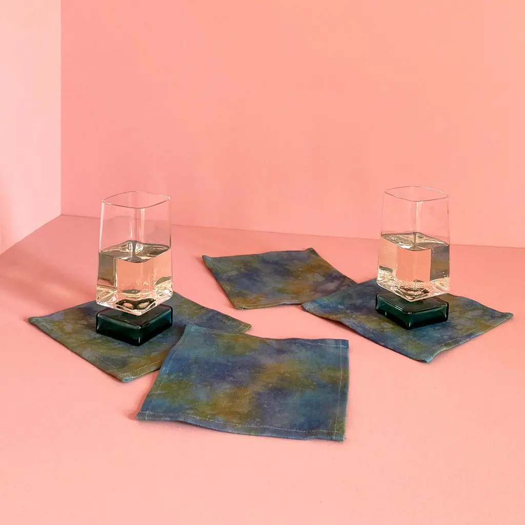 Moonrise linen cocktail napkins, set of four. Beautifully merging indigo, aqua and gold dyes on linen. Sustainably hand-dyed in small batches and sewn in New York City. Napkins measure approximately 6 x 6 inches. Each linen napkin is hand dyed and one of a kind. This series is inspired by the sky above New York City, which provides endless material with stunning cloud patterns and majestic sunsets.Note: Slight variations may occur within the design. Care Instructions: Hand or machine wash cold on delicate cycle. Hang to dry.