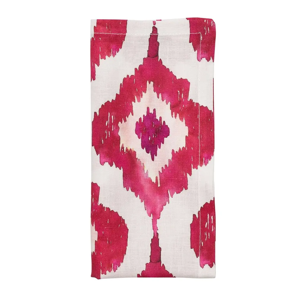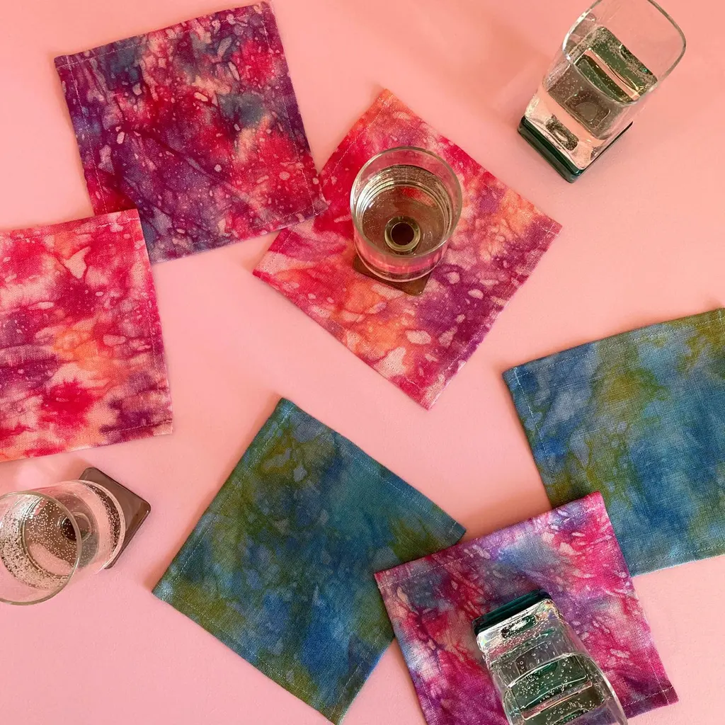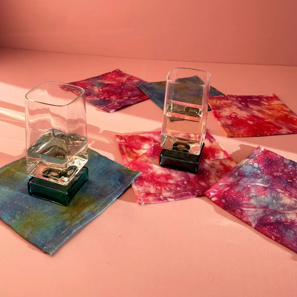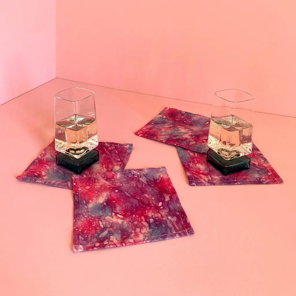 Nightfall linen cocktail napkins, set of four. Beautifully merging magenta, indigo and lavender dyes on linen. Sustainably hand-dyed in small batches and sewn in New York City. Napkins measure approximately 6 x 6 inches. Each linen napkin is hand dyed and one of a kind. This series is inspired by the sky above New York City, which provides endless material with stunning cloud patterns and majestic sunsets.Note: Slight variations may occur within the design. Care Instructions: Hand or machine wash cold on delicate cycle. Hang to dry.
