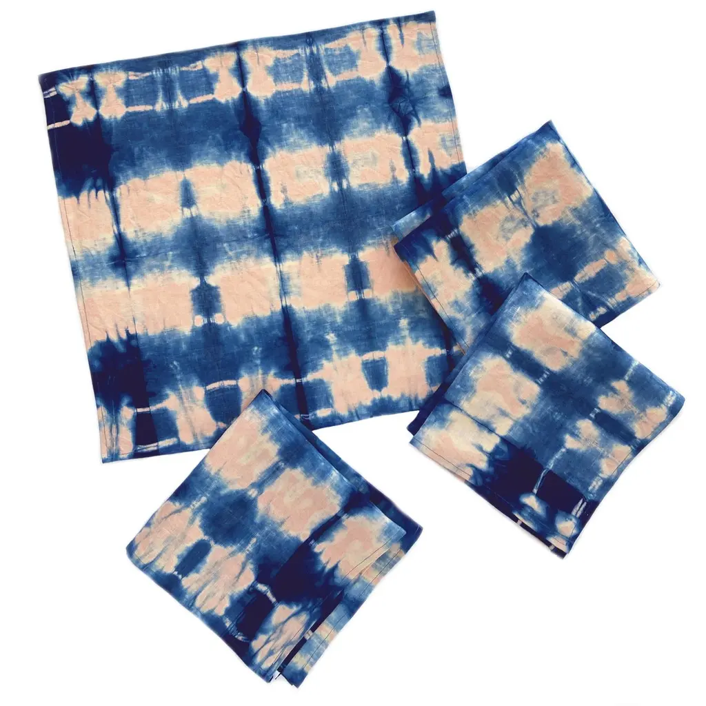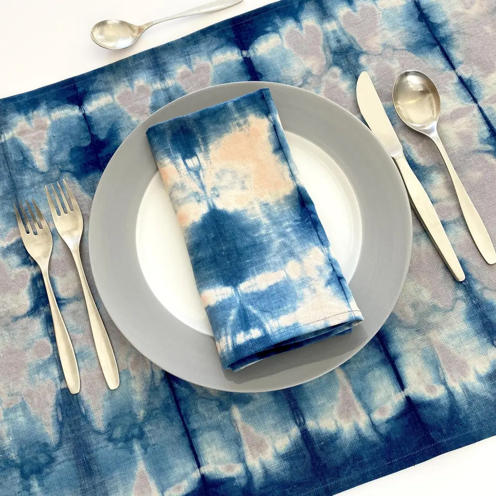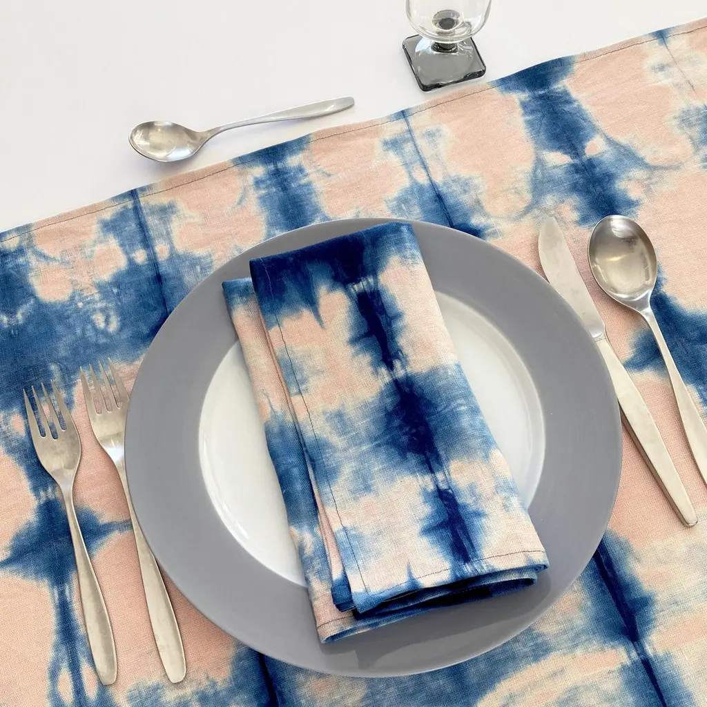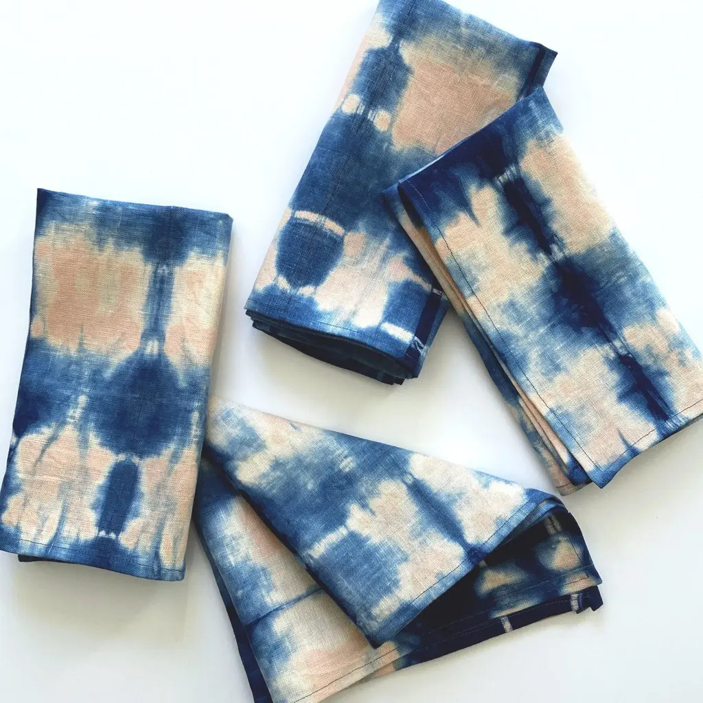 Rose linen napkins, set of four, dyed with indigo in Pleat pattern. Sustainably hand-dyed and sewn in New York City. Napkins measure approximately 18 x 18 inches. Each linen napkin is hand dyed and one of a kind. Each linen panel is cut and folded by hand, in the shibori style, before it is dyed through a series of indigo dips. To achieve a rich blue color, each is dipped and oxidized several times, before setting, hand-washing and drying. Note: Slight variations may occur within the design. Care Instructions: Hand or machine wash cold on delicate cycle. Hang to dry.