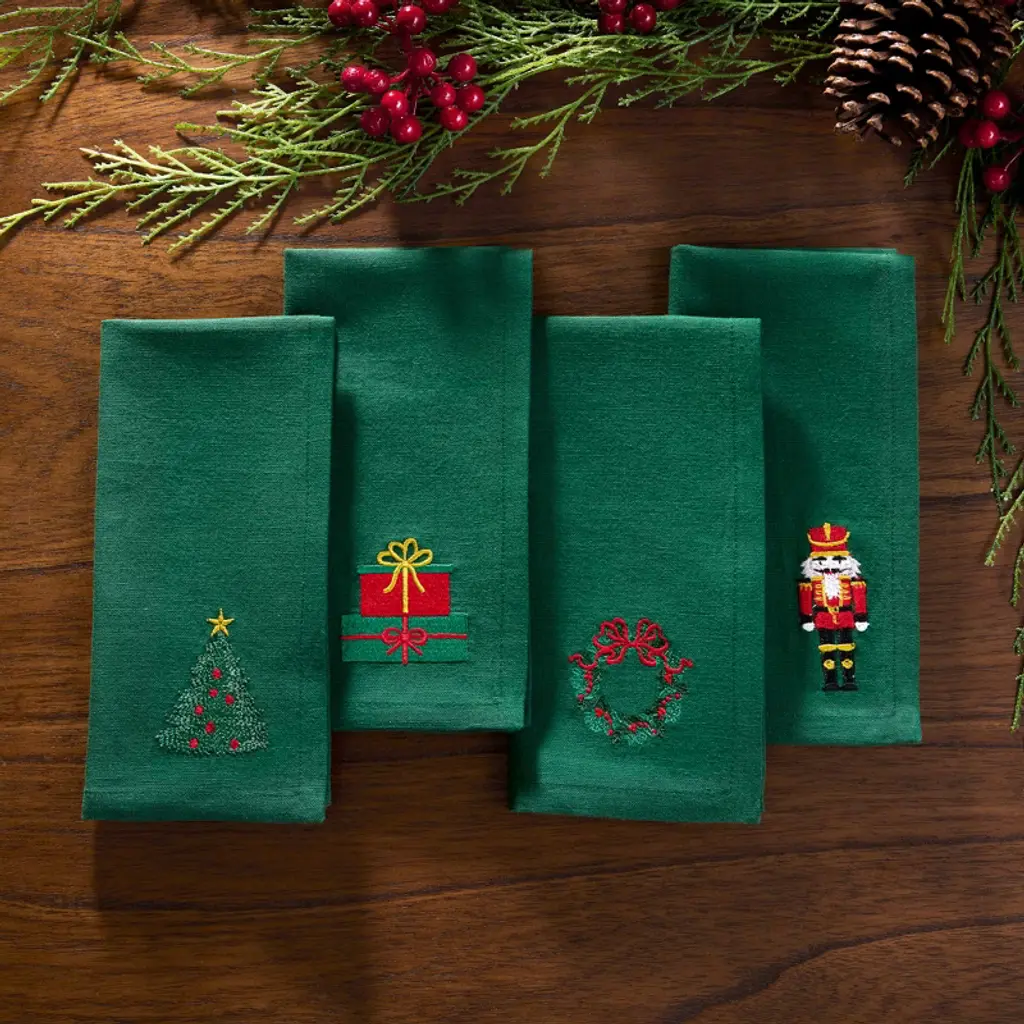 Celebrate the season in style with the Holiday Embroidered Napkin Set. Designed to bring a touch festive charm to any tablescape, each napkin in this set of four features a beautifully embroidered holiday motif, including a nutcracker, wreath, Christmas tree, and stack of gift boxes. Available in rich red, classic green, and crisp white, these napkins are perfect for mixing and matching with your favorite holiday table decor. Crafted from soft and durable 100% cotton, this set of reusable napkins is designed for repeated use, ensuring your holiday tablescape remains effortlessly elegant year after year. Hemmed edges provide a polished finish while preventing wear and tear. Coordinate to any of the Elrene Home Fashions Holiday Table Collections to complete the look!