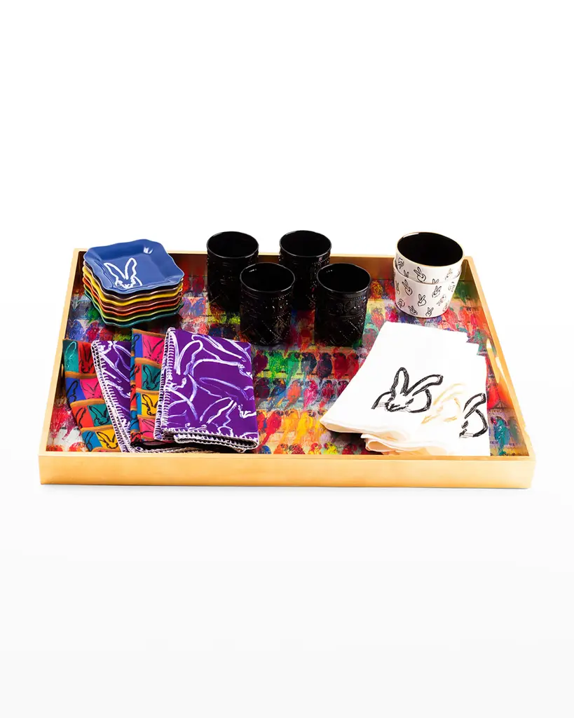 About Hunt Slonem Hop Up Shop: The wonderful and whimsical world of world-renowned American artist Hunt Slonem is now available in a brilliant collection of artfully designed luxury home goods and fashion accessories. Hunt’s famous bunnies, butterflies, birds and more all magically come to life on impeccably made items such as dinnerware, tabletop, bed linens, embroidered decorative pillows, cashmere throws and velvet blankets, gifts and more Decorative napkin is made of linen. Sold individually. Approx. 20"Sq. Imported. About Hunt Slonem: Hunt Slonem is best known as a painter, but he’s also a sculptor, collector, and author. His art and life are forever inspired by his connection to the spiritual and natural worlds, his travels, and his passion for color. Slonem’s evocative and fanciful world of bunnies, butterflies, and birds all magically come to life on dinnerware, serving pieces, glassware, lacquer placemats, napkins, vintage furniture, bedding, blankets, throws, and decorative pillows. This collection is a way for him to share his art with home design enthusiasts, art lovers, and collectors alike, bringing his iconic art to life in new mediums.