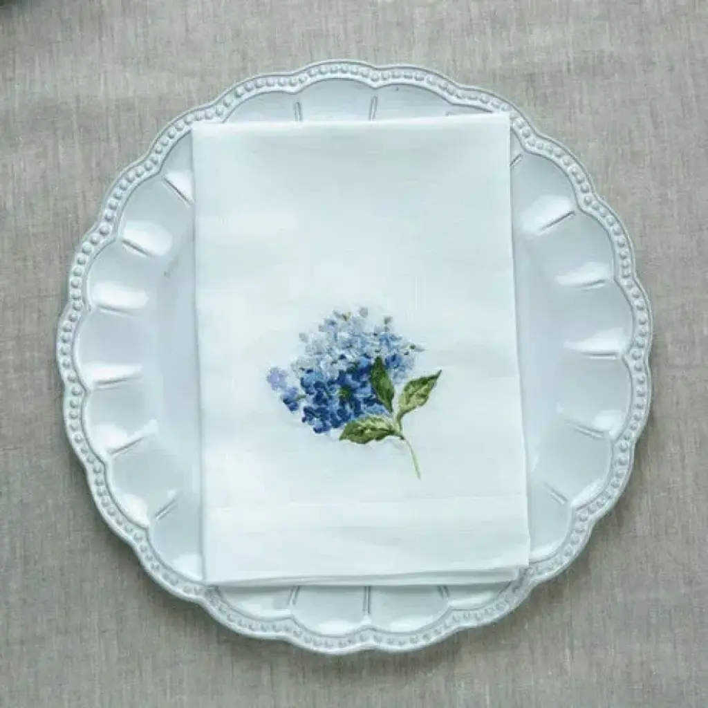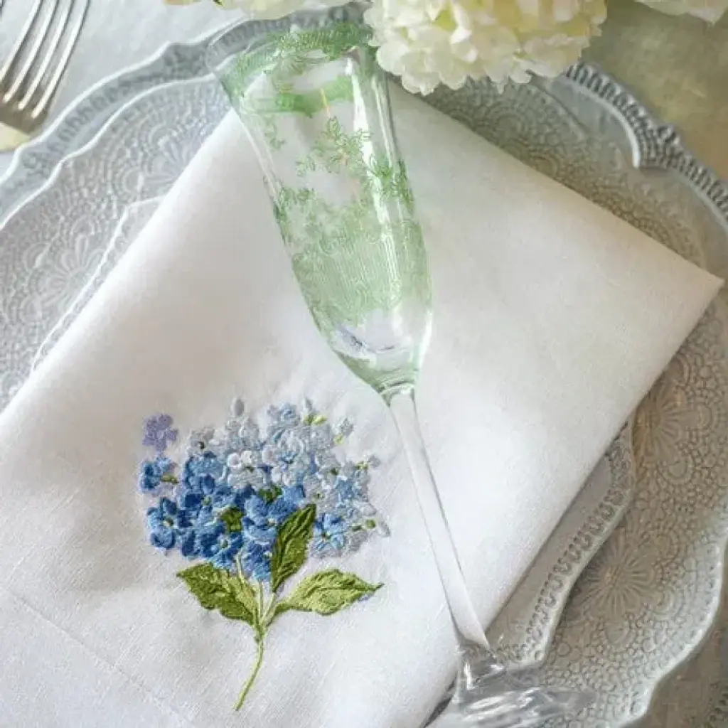 Our 100% European linen tri-fold napkin set is a perfect mix of elegance and beauty. Each napkin is embroidered with a detailed Vintage Floral embroidery in the center.