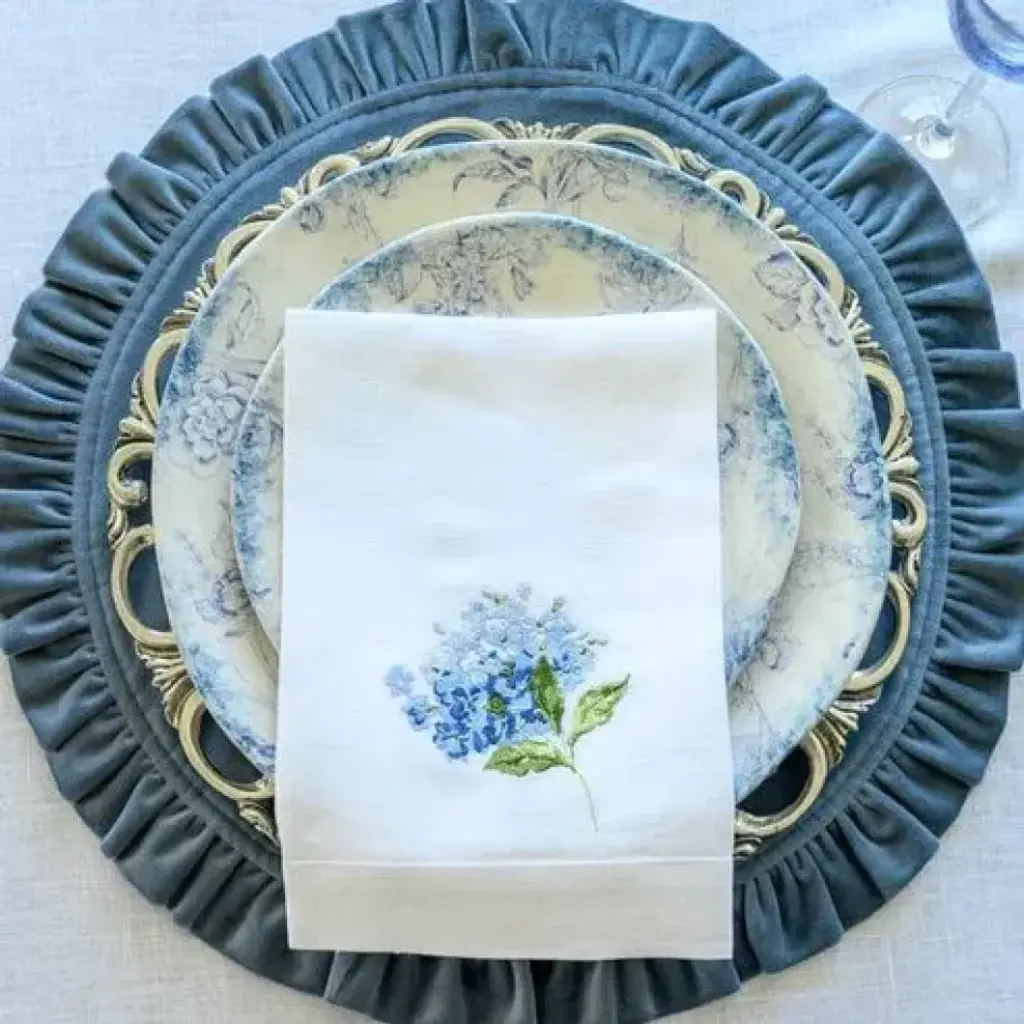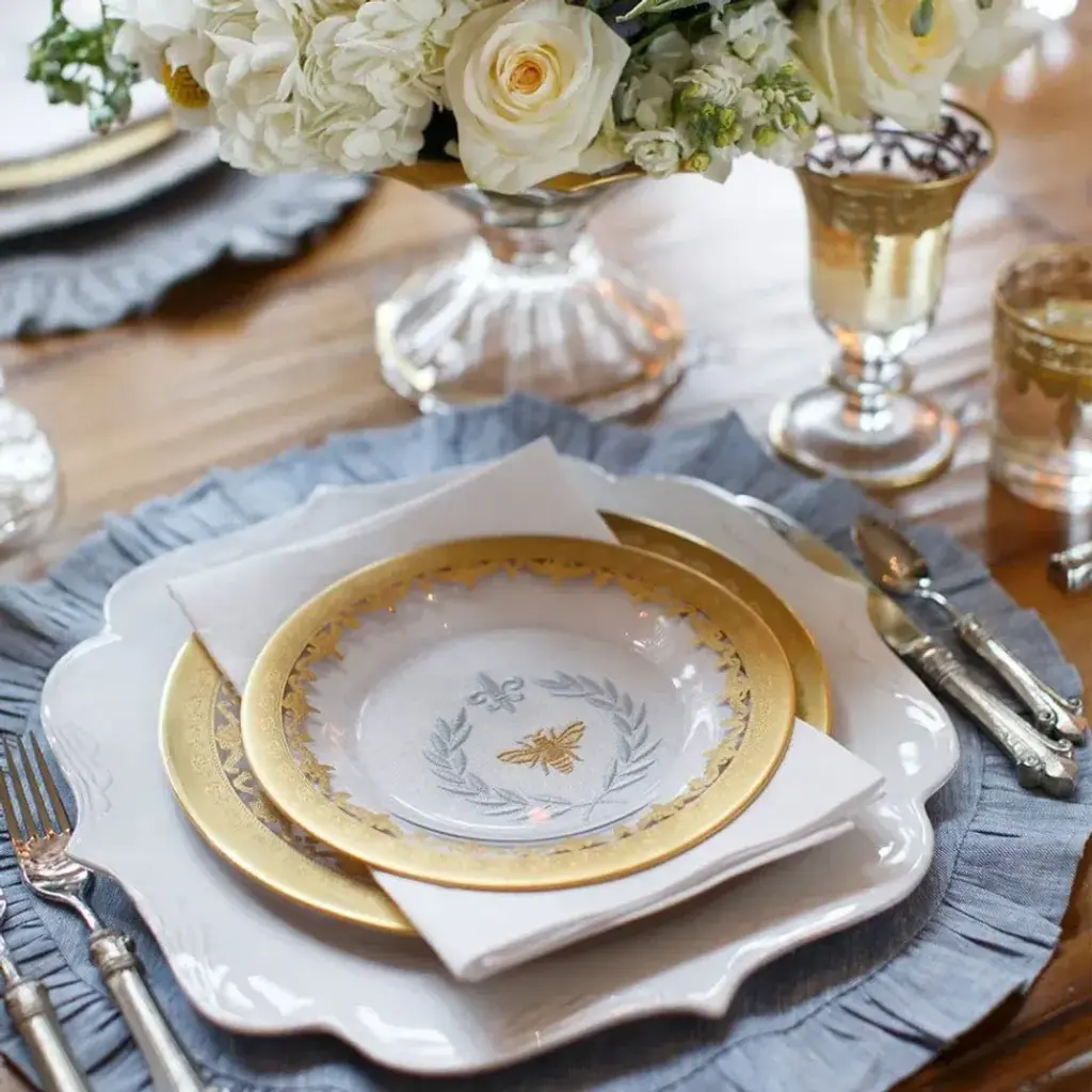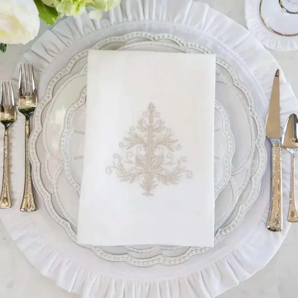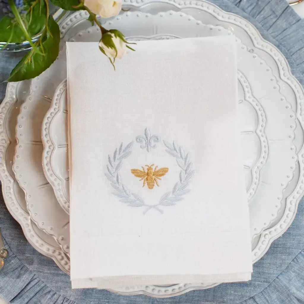 Crown Linen Designs 100% European linen napkins are a perfect mix of elegance and beauty. Combine with a runner, table topper or placemats to finish off the look. Each towel is embroidered with an "Italian Bee" design.