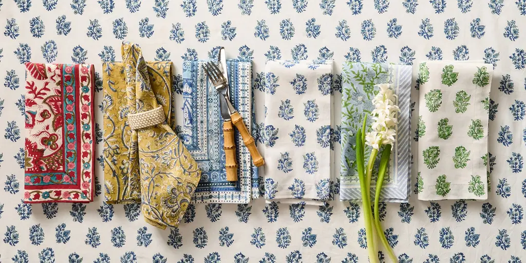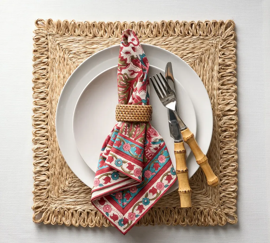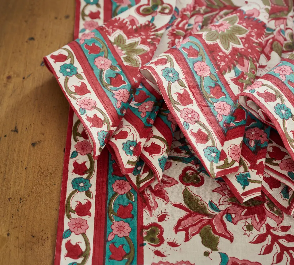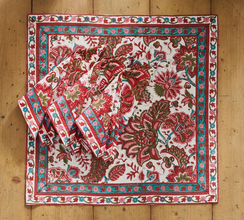 Rich reds and abundant florals easily transform a table with color, energy, and character. The detailed pattern is block printed by hand and counterbalances the flow of paisley-like botanicals with the precision of a linear border. One layer that works wonders.