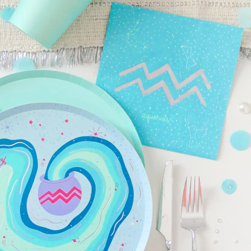 It’s giving cosmic energy! Each piece in this collection is designed to reflect each of the twelve astrological signs, bringing celestial charm to your celebrations. Bold Leo? Dreamy Pices? The stars are aligning for this new collection! Created for our deep thinking, innovative and creative girlies, this Aquarius Large Napkin captures the essence of creative and free-thinking souls. Pack of 16 Large NapkinsMeasures 6.5" x 6.5"Paper NapkinsNot safe for microwave use