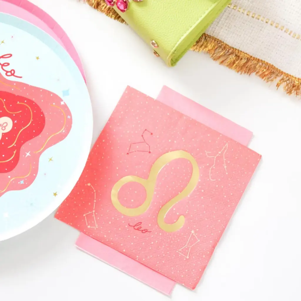 It’s giving cosmic energy! Each piece in this collection is designed to reflect each of the twelve astrological signs, bringing celestial charm to your celebrations. Bold Leo? Dreamy Pisces? The stars are aligning for this new collection! Regal and radiant, our Leo Large Napkin is a celebration of our lion-hearted leaders. Pack of 16 Large NapkinsMeasures 6.5" x 6.5"Paper NapkinsNot safe for microwave use