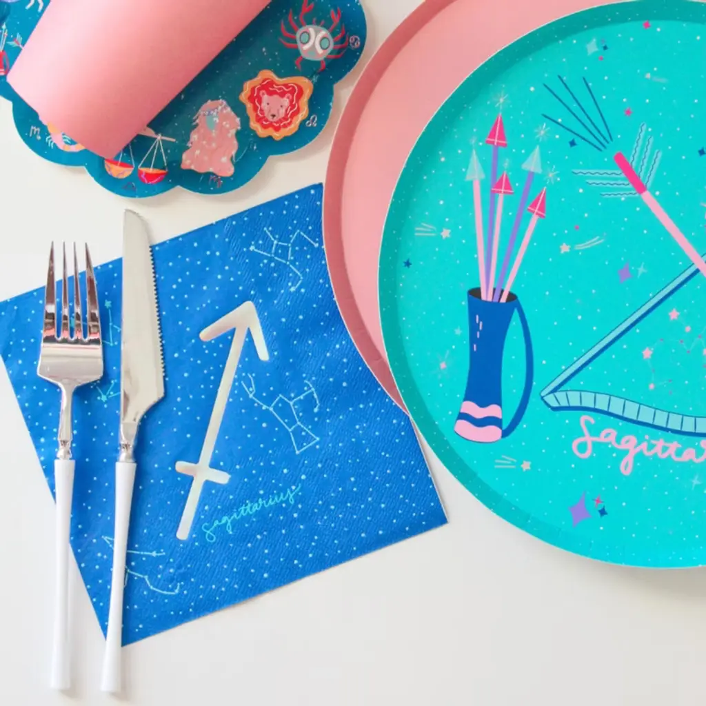 It’s giving cosmic energy! Each piece in this collection is designed to reflect each of the twelve astrological signs, bringing celestial charm to your celebrations. Bold Leo? Dreamy Pisces? The stars are aligning for this new collection! Vibrant and eclectic, our Sagittarius Large Napkin is designed for these bold, optimistic, wanders at heart. Pack of 16 Large NapkinsMeasures 6.5" x 6.5"Paper NapkinsNot safe for microwave use