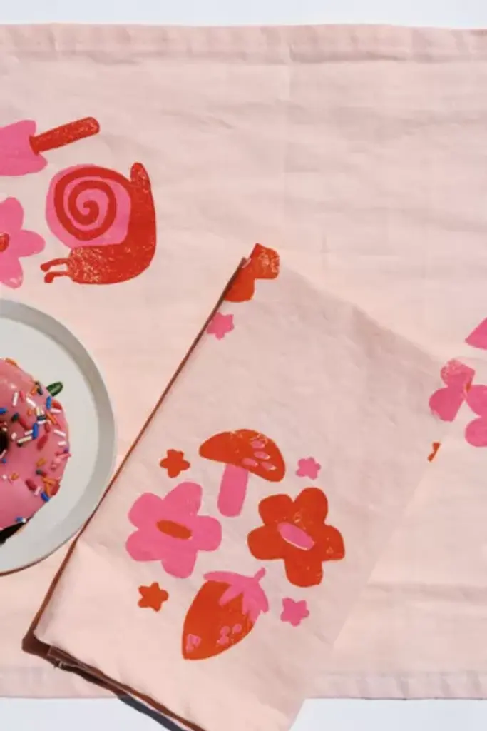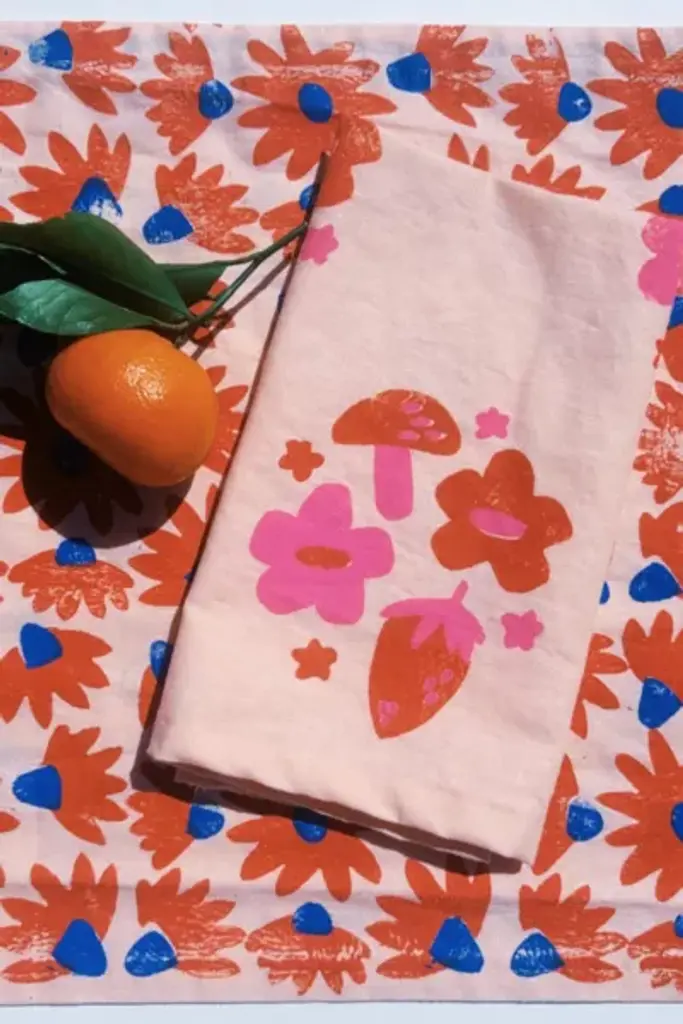 This set of four dinner napkins features Julie Peach's Berry Shroom pattern on a machine washable cotton-linen blend. Each piece has been individually hand block printed in Julie's Denver studio with her hand-carved printing blocks. No two will ever be exactly alike! **Content + Care** \- 55% Linen / 45% Cotton \- Soft, oversized napkins \- Finished hemmed edges \- Machine wash cold & tumble dry low - iron as needed **Size** \- 18"x22"