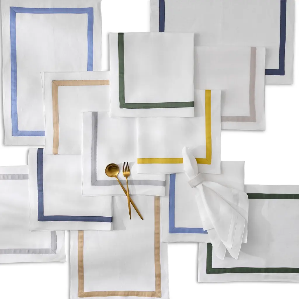 A classic sateen border adorns the tablecloth, placemat and napkins of Matouk's iconic and best-selling Lowell linen collection.