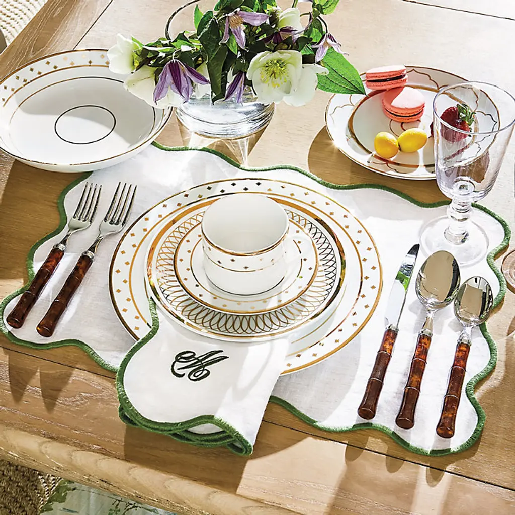 Scallops are one of our favorite decorating trends to add a hint of softness and subtle femininity to any decor. Our Maisie Scalloped Dinner Napkins are handmade of supple 100% linen and trimmed in your choice of three stylish colors to accentuate the gently scalloped square shape. Add a monogram in matching color for a signature look. Maisie Scalloped Dinner Napkin features: *Additional charges may apply. *Allow 3 to 5 days for monogramming plus shipping time. *Please note that personalized items are non-returnable.