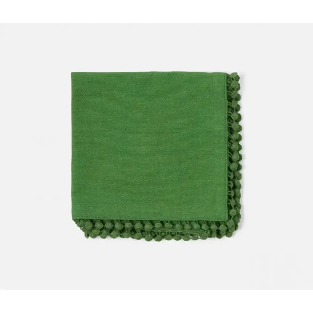Margot Dark Olive, Pom Pom Border, Cocktail Napkin, Cotton Canvas, 11x11, Pack Of 4