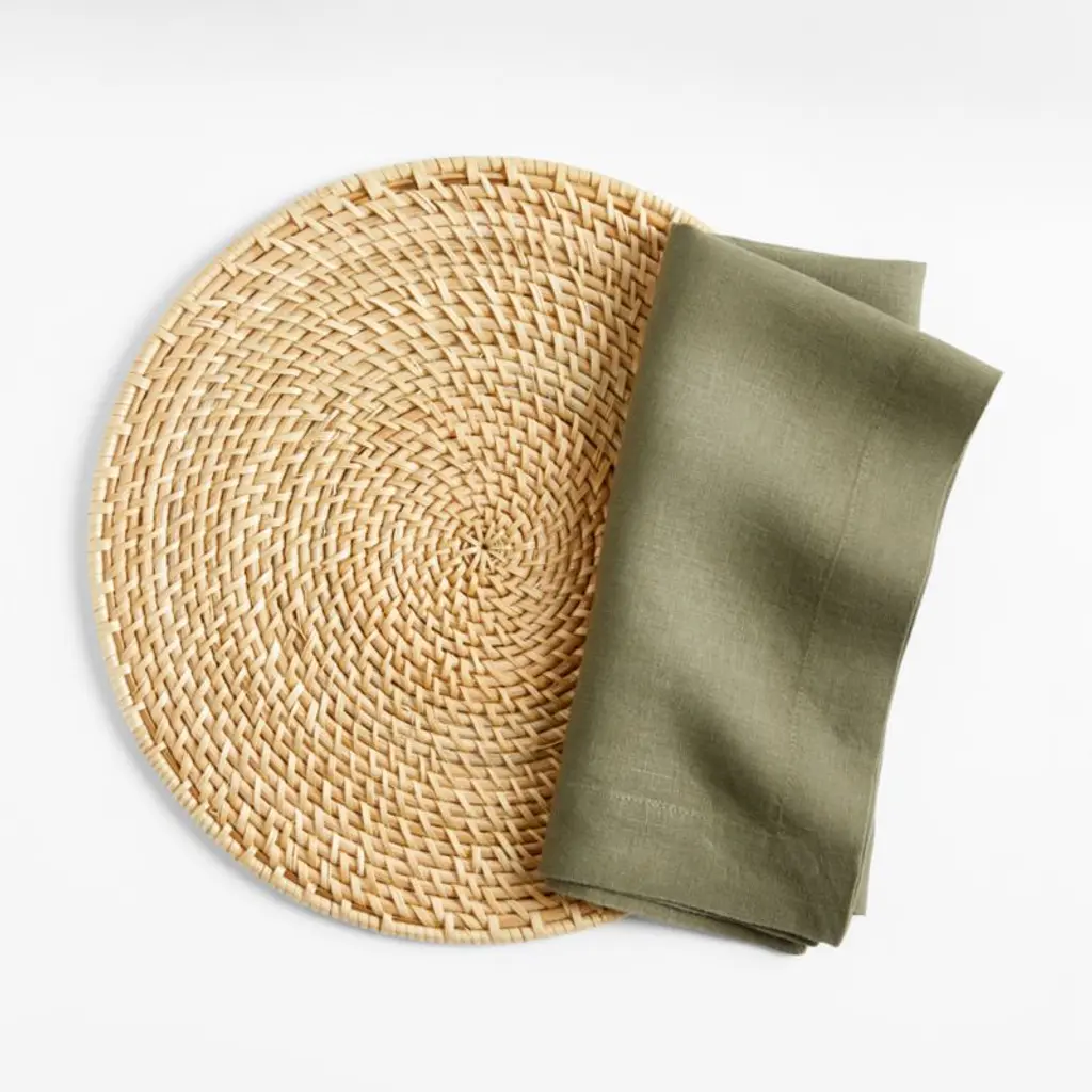 Our pure linen cloth napkin unfolds to a generous 22-inch square in moss. Pre-washed for extra softness, our green-brown napkin pairs with our dark or neutral dinnerware for a modern organic look. Tailor-finished with a 1.5-inch hem and mitered corners, the machine-washable linen napkin is a Crate & Barrel exclusive.