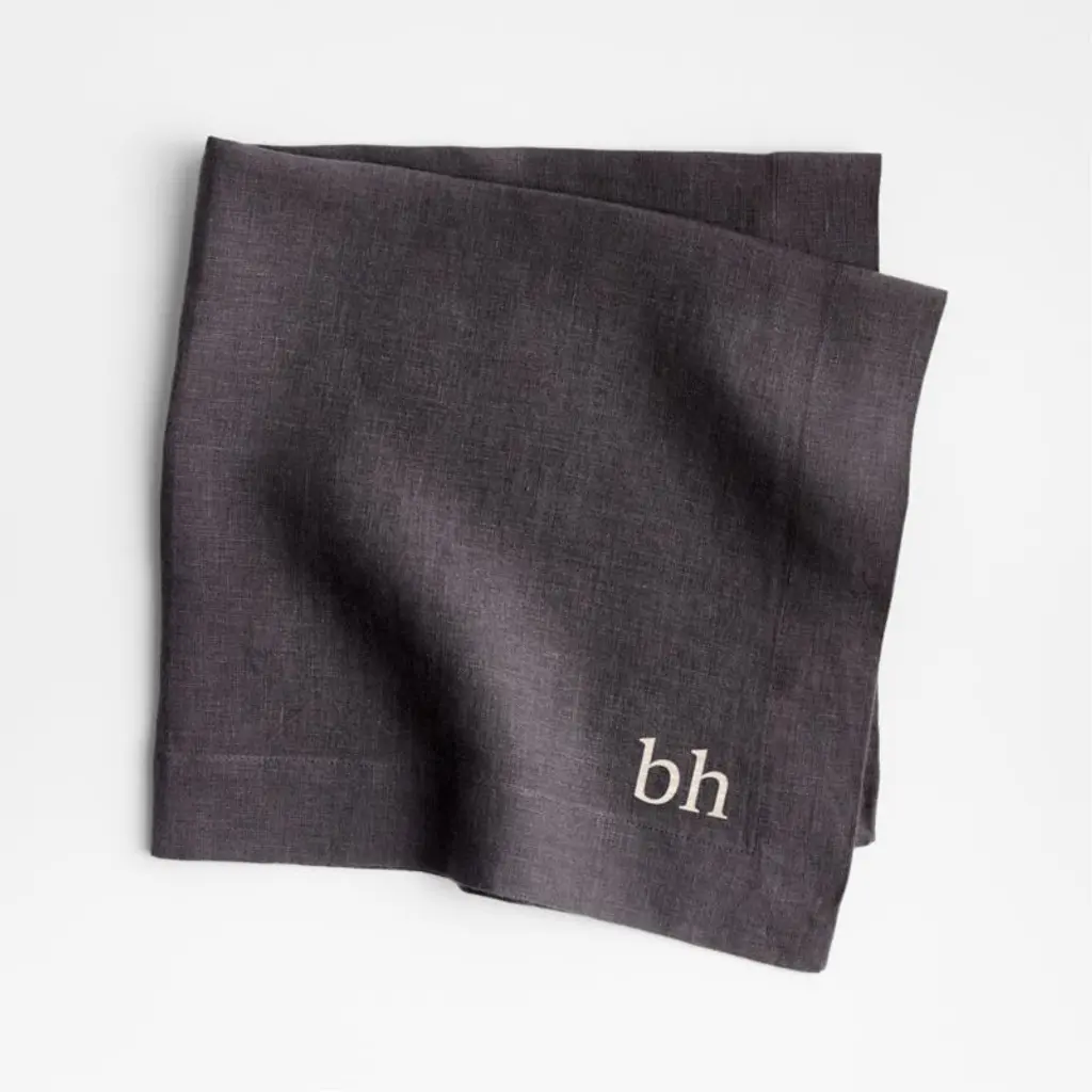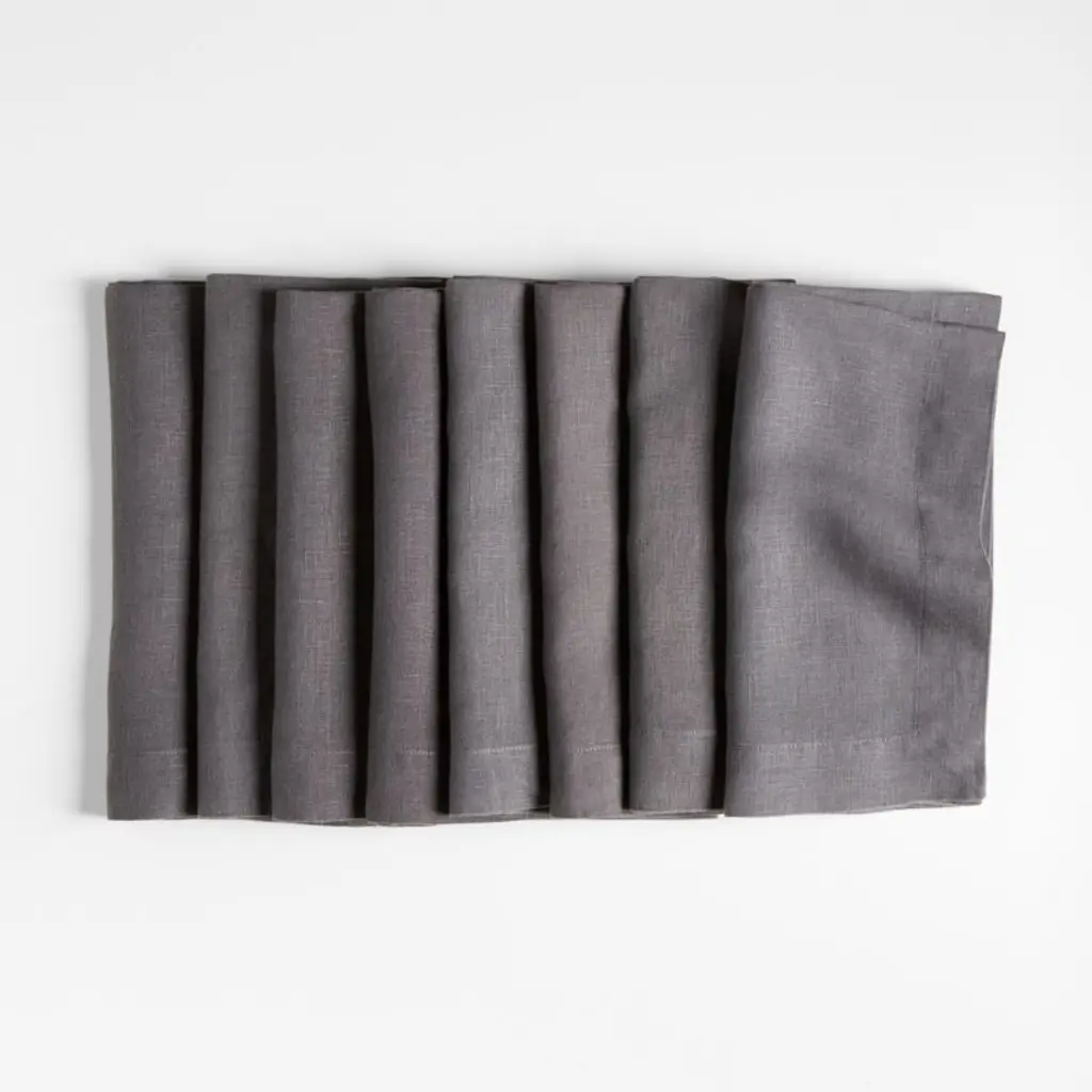 Our 100% linen napkins unfold to generous 22" squares in beautifully neutral and vibrant hues, pre-washed for extra softness. A Crate & Barrel exclusive, this set of eight cloth napkins in graphite pairs perfectly with modern dinnerware and cleans up easily in the washing machine and dryer. We've finished each grey napkin with generous hems and mitered tailoring, classic diagonal seaming that creates a crisp corner.
