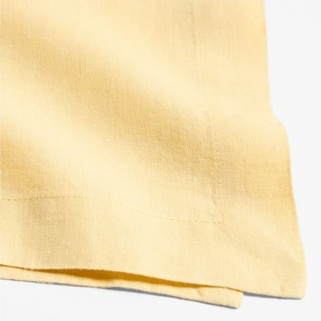Part of our Marin table collection, this soft yellow dinner napkin is made of quality European linen that's exceptionally soft and supple. Each pastel yellow napkin unfolds to a generous 22-inch square, pre-washed for extra softness. Tailored with mitered corners, the linen napkin pairs beautifully with our modern dinnerware and cleans up easily in the washing machine and dryer.
