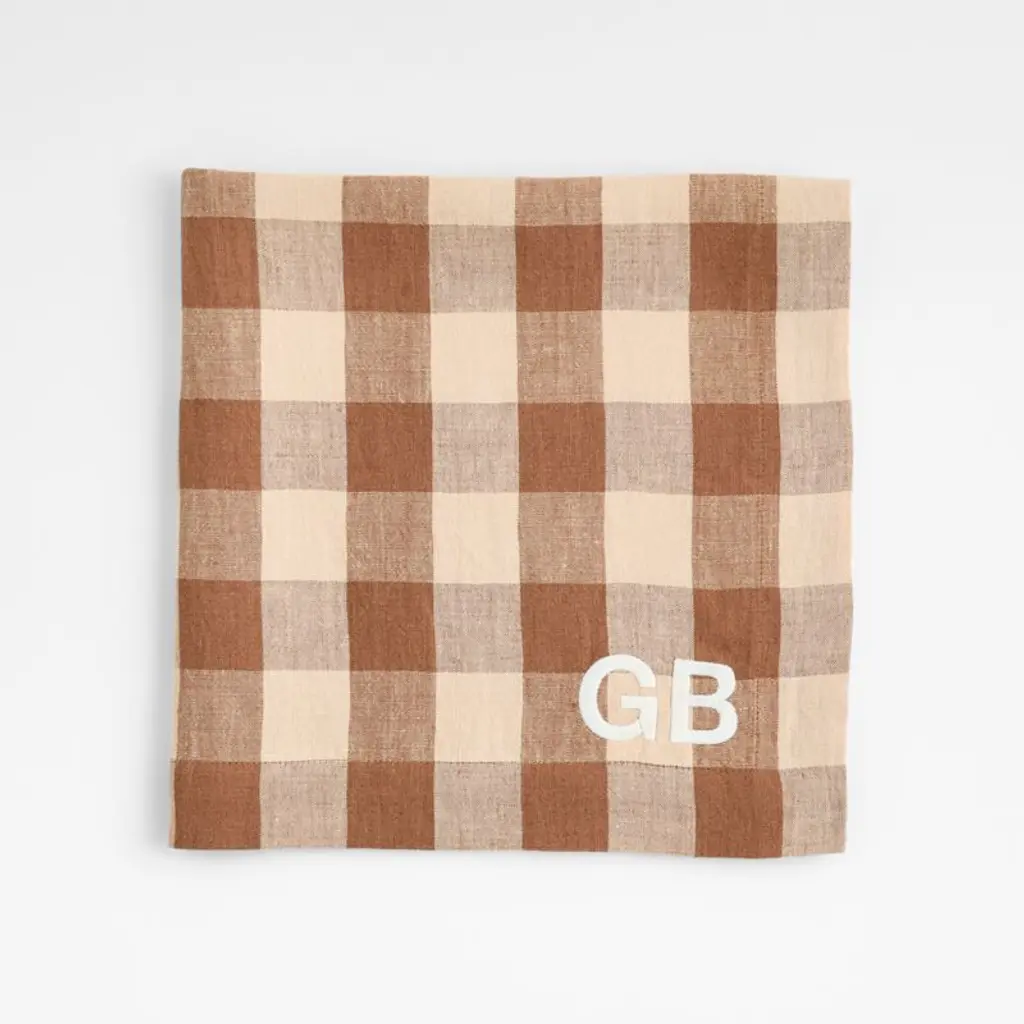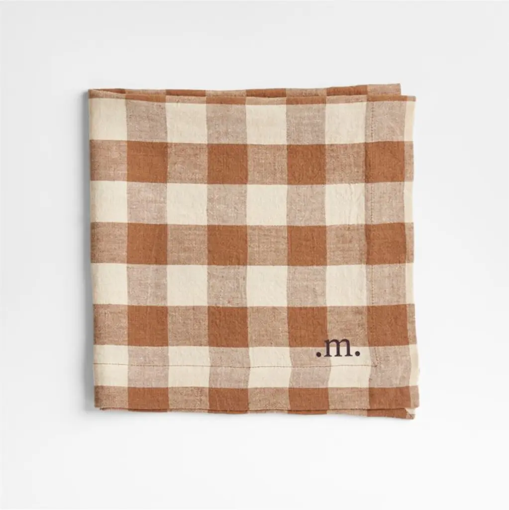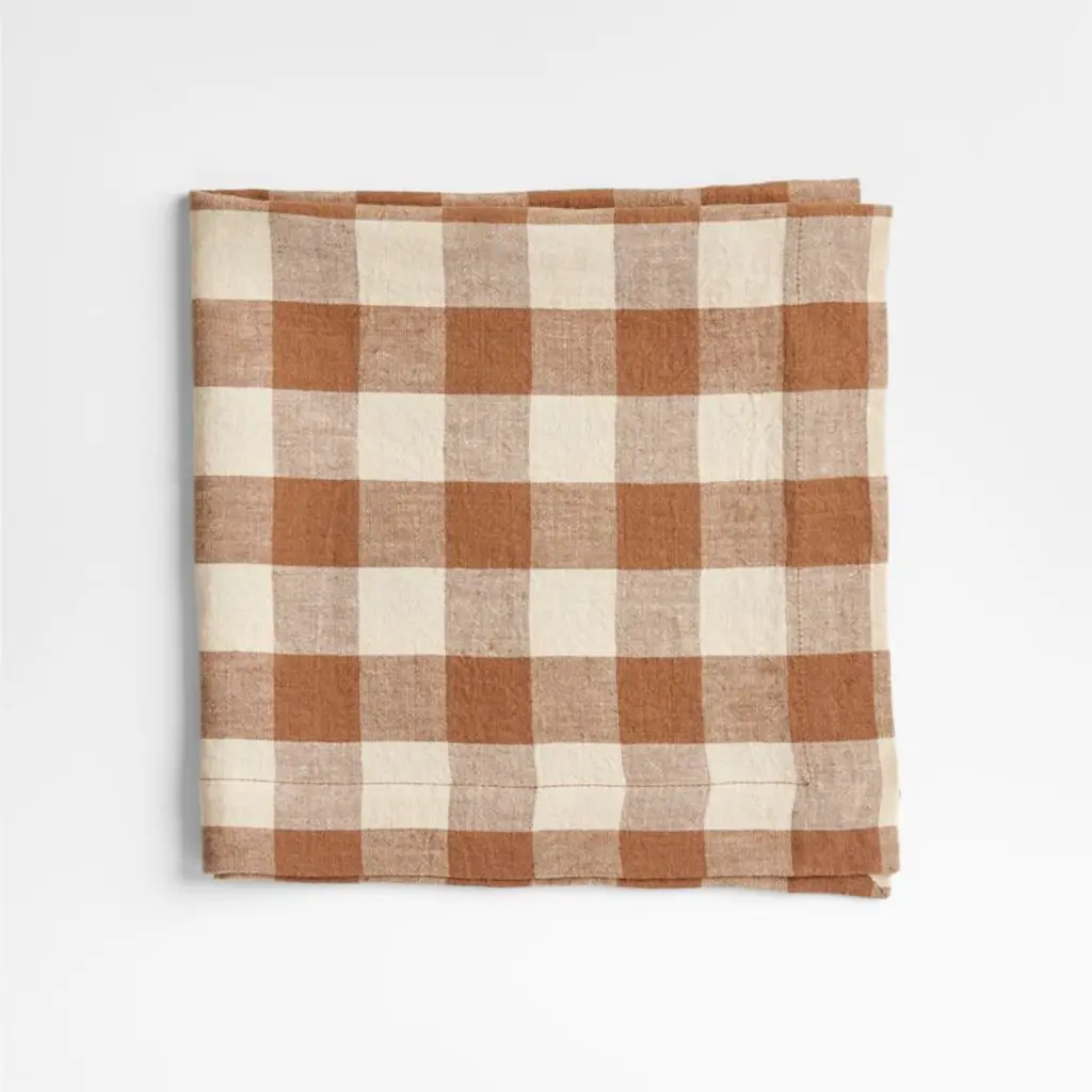 Walnut brown and creamy natural lines intersect in a modern buffalo check napkin with homespun charm. Our sustainable linen napkin unfolds to a lavish 22-inch square with generous hems. Prewashed for extra softness, the machine-washable cloth is finished with mitered tailoringdiagonal seaming that creates crisp corners. We love the way this buffalo plaid napkin pairs with our natural-hued artisanal dinnerware to set a warmly welcoming table.View our Marin collection
