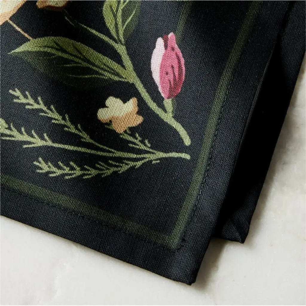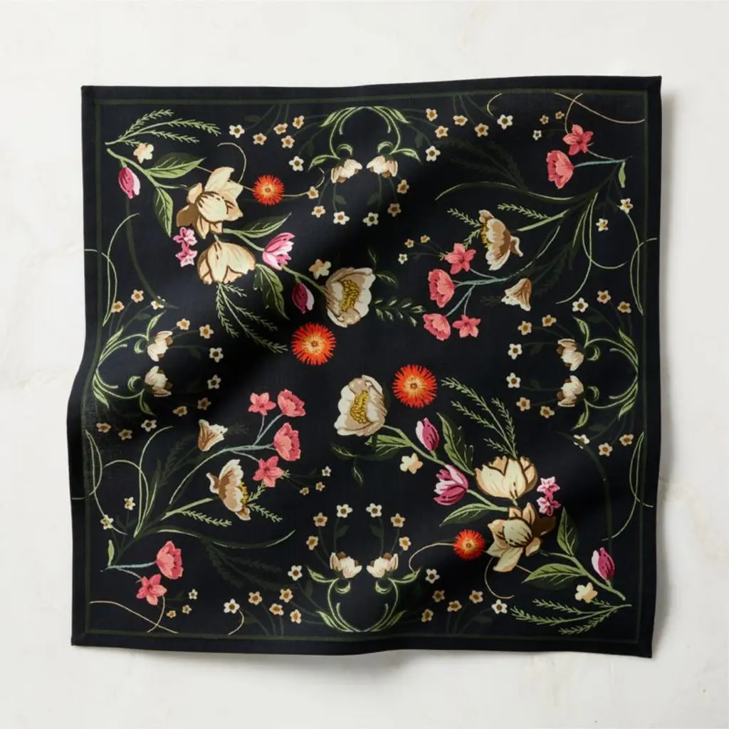 Botanical print napkin by London-based textile designer Felix Green adds a vibrant pop of color to the table. Made from soft cotton with linen for a touch of texture, the napkin features detailed florals inspired by designer silk scarves. Digitally printed to capture every elegant detail. CB2 exclusive.