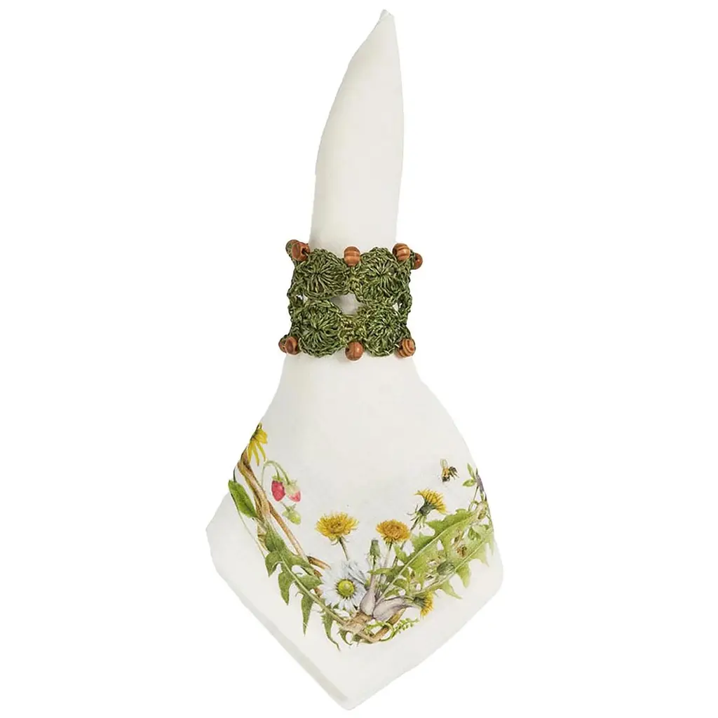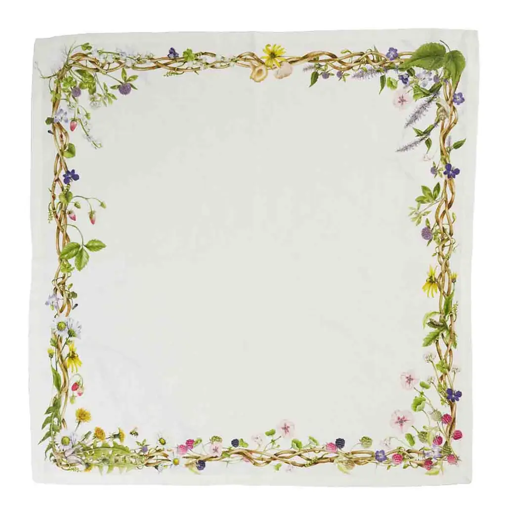 Crisp, cream-colored linen is strewn with a wildflower border amongst berries and brambles (with a sprinkling of little creatures just waiting to be discovered) upon this enchanting napkin that is the perfect embellishment for spring brunches to summer fêtes.