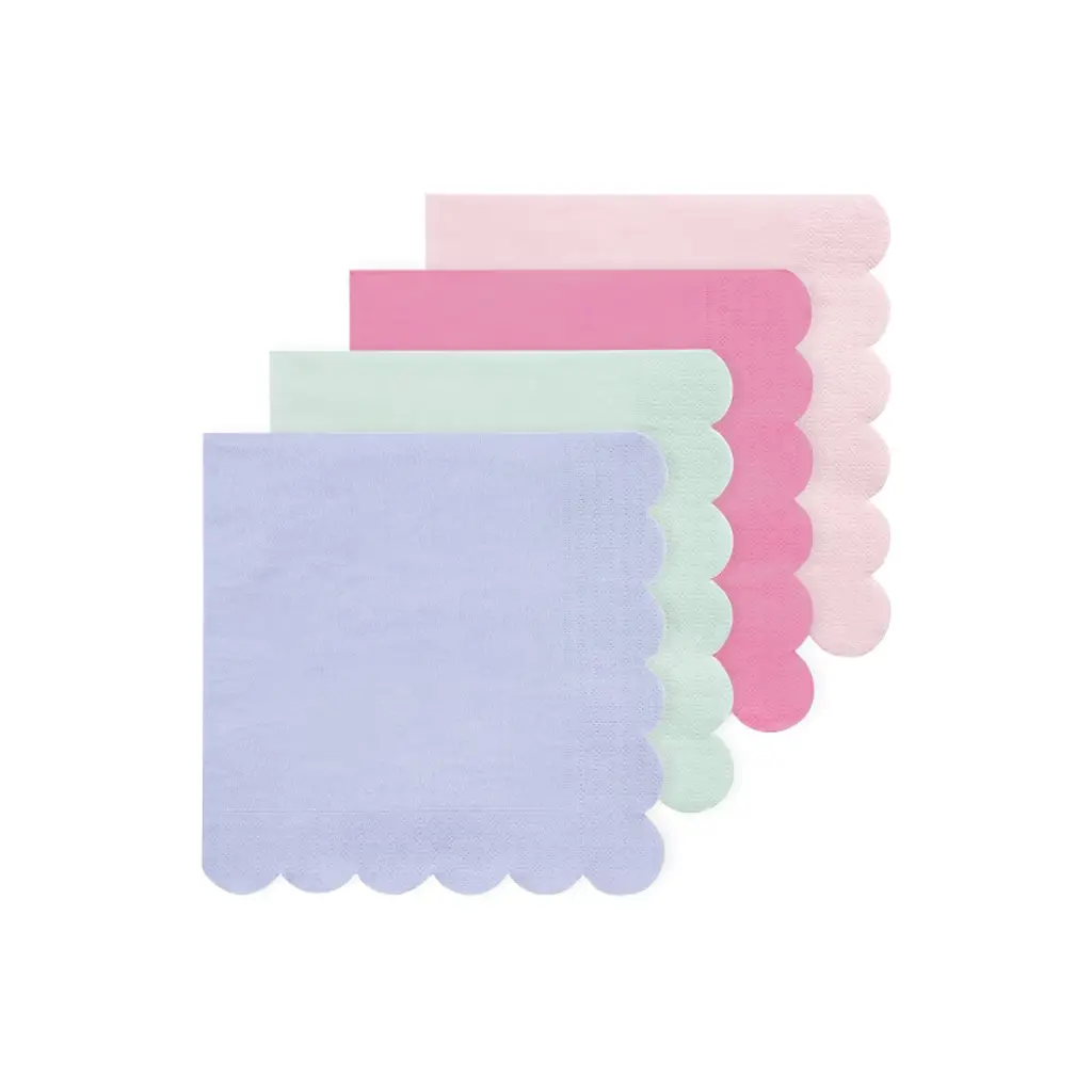 Celebrate in style with this stunning set of pink napkins, mint green napkins and violet napkins. Practical and pretty, these paper napkins will add a lovely finishing touch to a special meal. They have a stunning scalloped edge for a stylish look, and have a textured border for interest and decoration. Made with top quality 3-ply paper, they are practical as well as decorative. They're ideal to use as birthday napkins, as baby shower napkins, or for picnics, garden parties, cocktail napkins or dinner party napkins. These small napkins are ideal for all ages, and work well for when you simply want to give a layered look to your table setting. This big multipack is perfect to use for a large gathering, or for several parties, and is great as a store cupboard essential too. These fancy disposable napkins are the perfect paper napkins to complement your other party supplies and decorations.