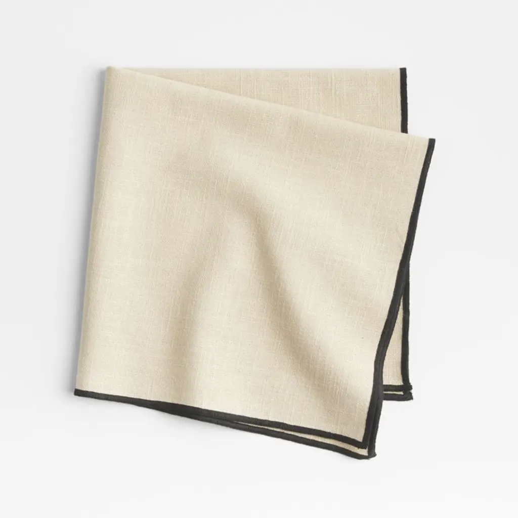 Black embroidery brings graphic impact to our natural Mercer dinner napkins. Made of organic cotton, the four neutral-hued napkins in the set feature merrow-stitched borders in contrasting black for a look that's clean-lined and classically modern.
