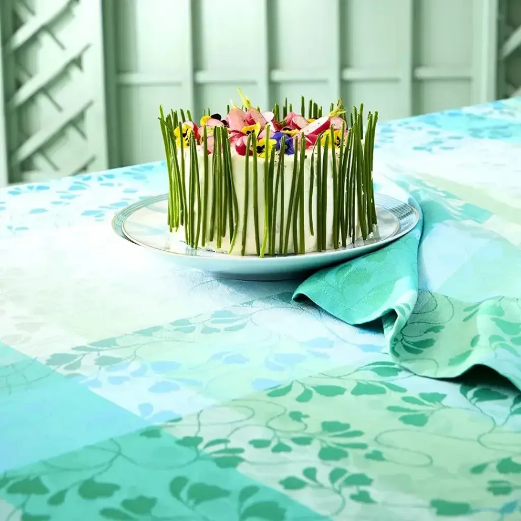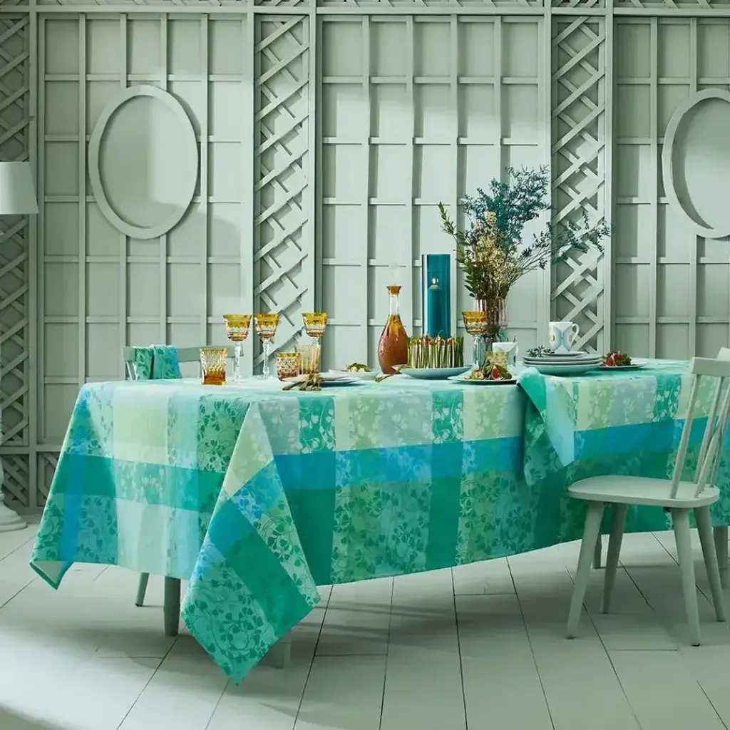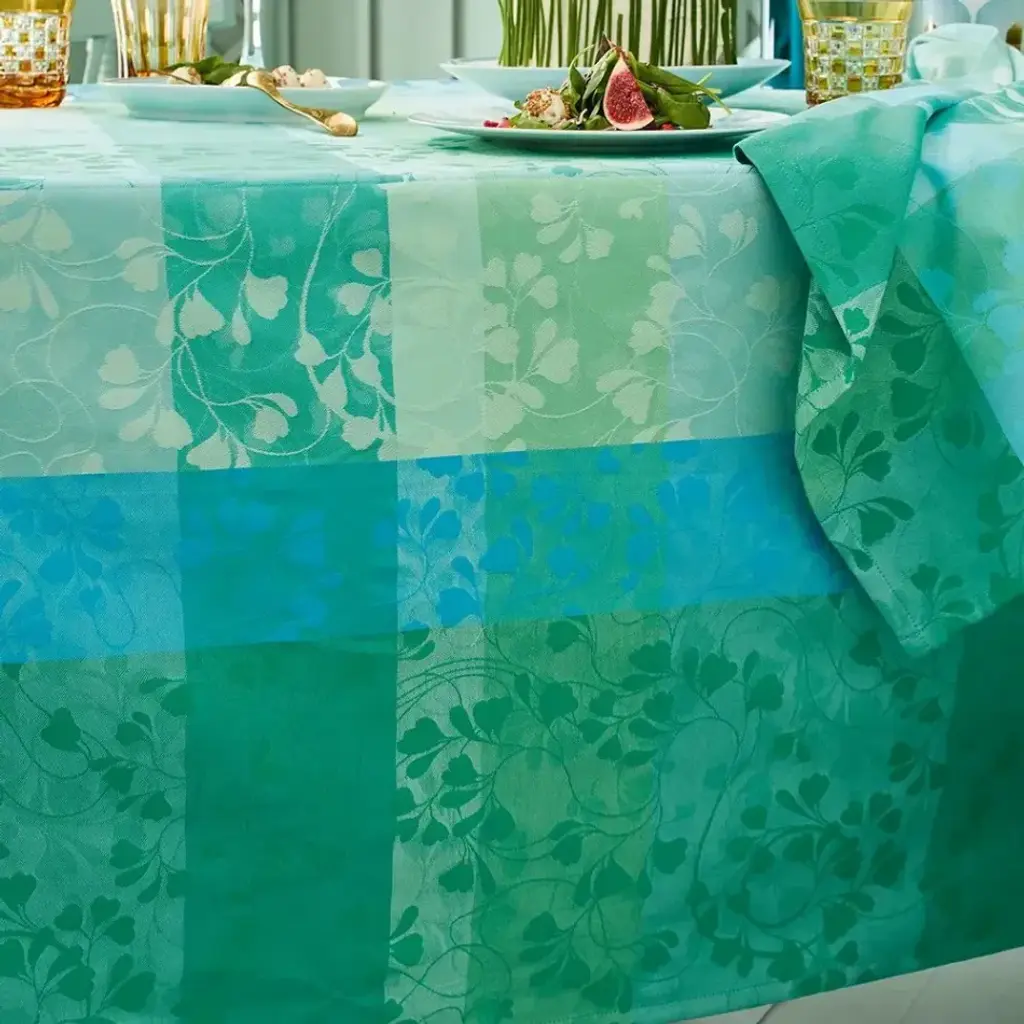 Curate the perfect table with the Mille Feuillages Turquoise Tablecloth by Garnier Thiebaut. This design features intertwining turquoise leaves in shades of green, blue, and cream, woven using jacquard looms with extra-long staple cotton for durability. Hand-drawn by in-house artisans, this tablecloth blends timeless artistry with lasting quality, ideal for any occasion. Since 1870, Garnier-Thiebaut has created classic and jacquard linens in the quintessential French style. Their linens have been used by the Four Seasons George V in Paris, the Mandarin Oriental Hotel in Geneva, The Ritz Carlton, Manama (Bahrain), Le Meridien Bora Bora, the Four Seasons Hotel, New York, and The French Laundry in Yountville.