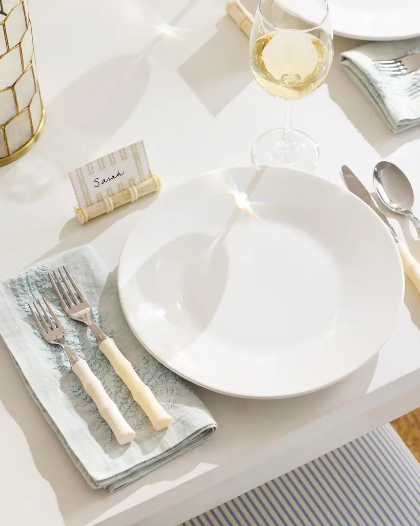 Of times past. Delicate embroidery inspired by our beloved Priano pattern adorns these pristine linen guest towels, napkins, and tablecloths.