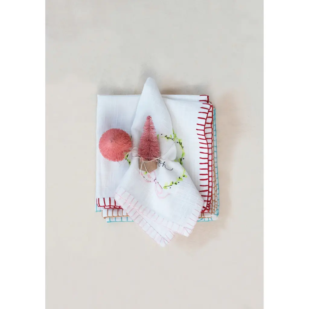 Liven up your festive feast with these 100% linen napkins, hand-embroidered in London with a personal touch!These vibrant beauties will be the toast of the table, adding a pop of color to your classic white linen—they're the yuletide accompaniment you've been dreaming of!We can add names under the embroidery also, please add below