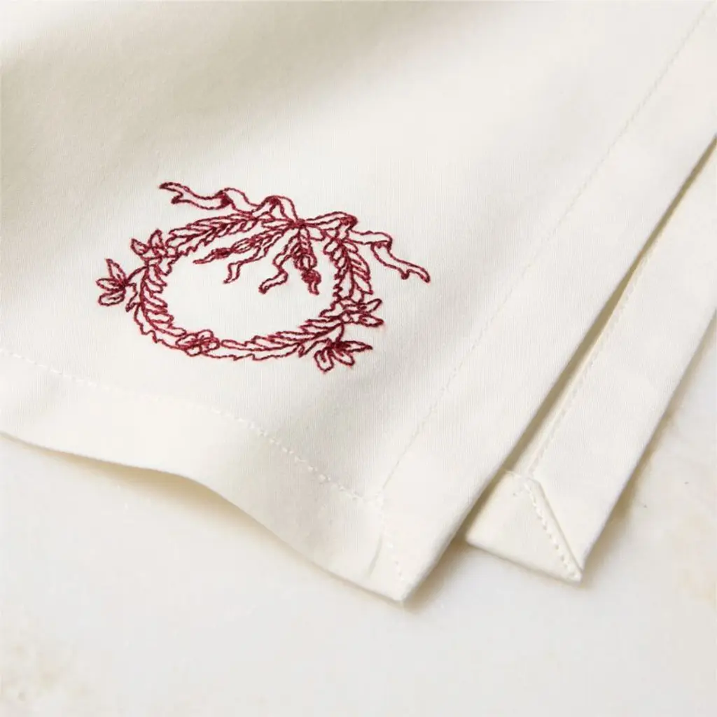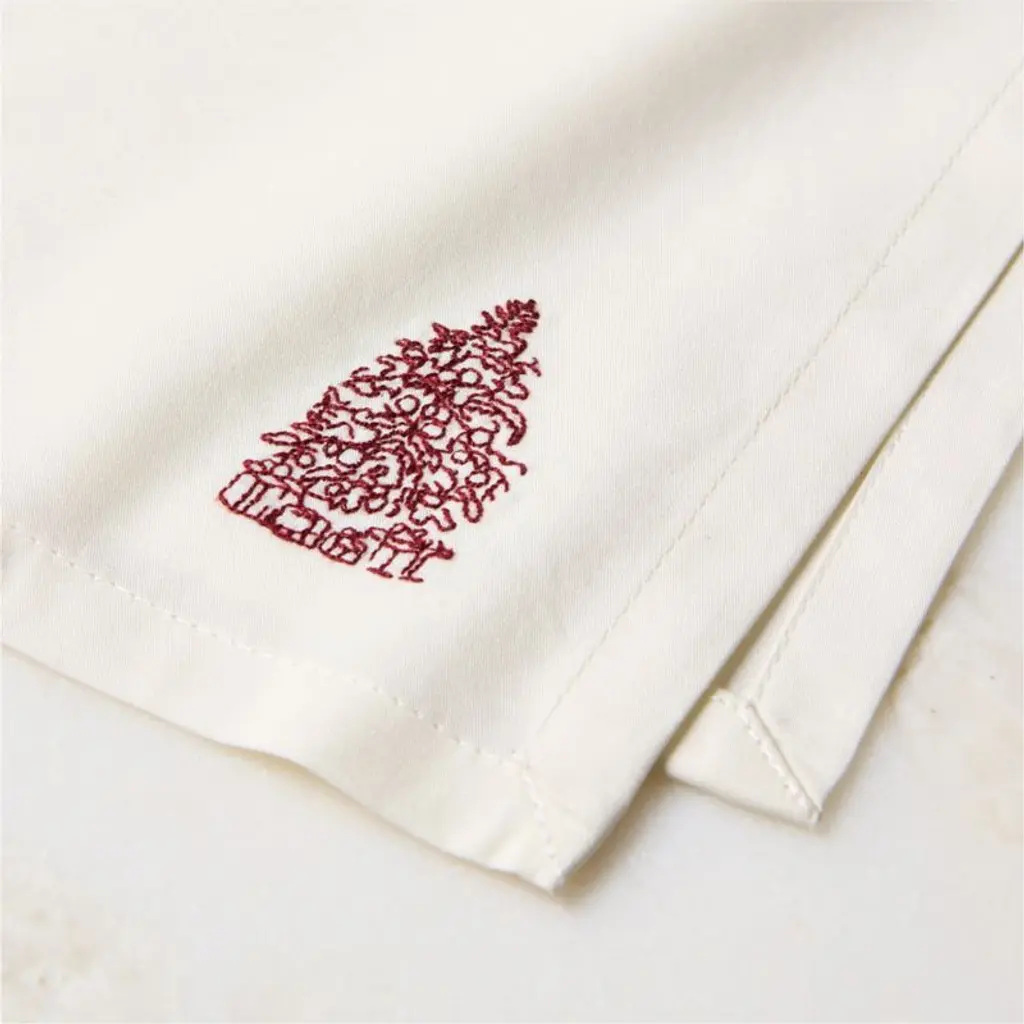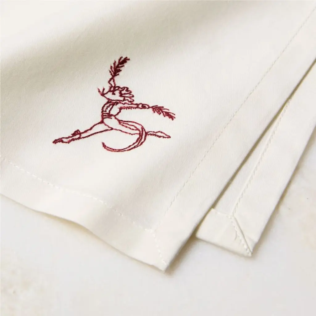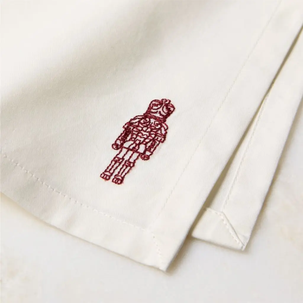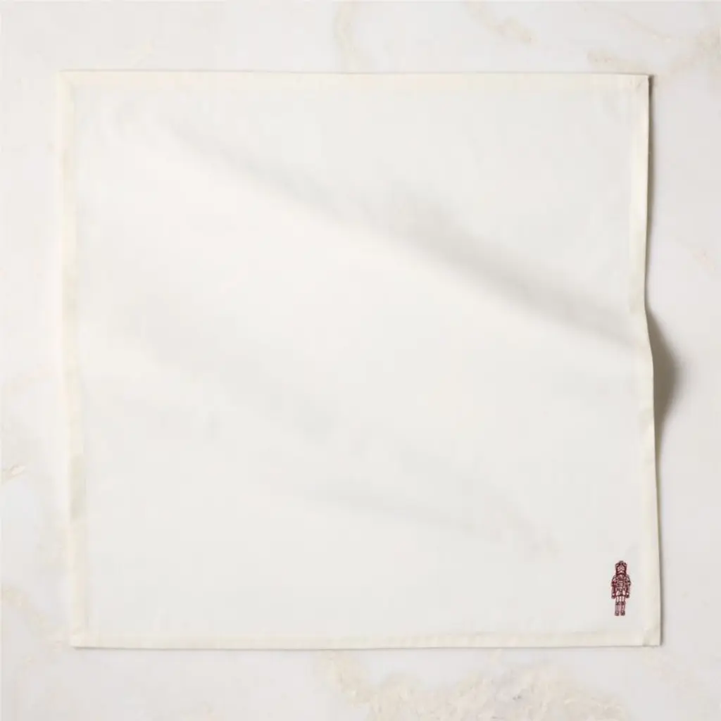 Woven of organic cotton, napkin set by House of Heras draws inspiration from the Nutcracker. The crisp white ground offers an understated backdrop for the napkins' intricately embroidered festive design. CB2 exclusive.
