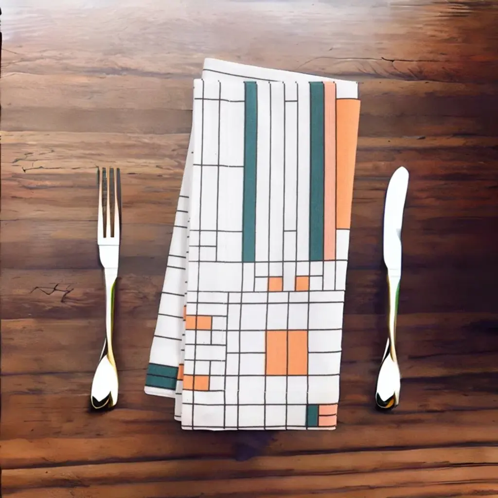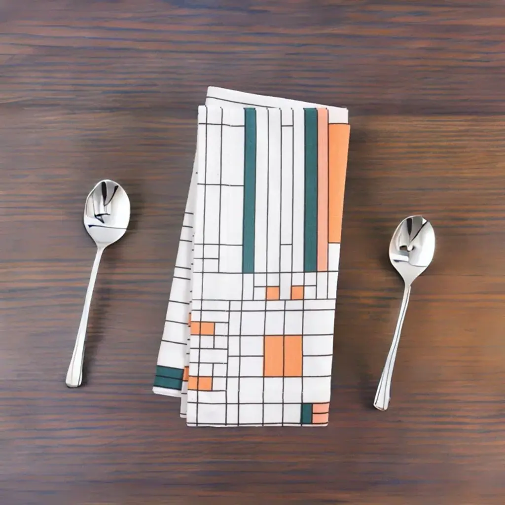 This napkin has a beautiful and elegant printed design inspired by the iconic work of architect Frank Lloyd Wright. Soft to the touch and featuring mitered corners, this napkin will add elegance to any setting.