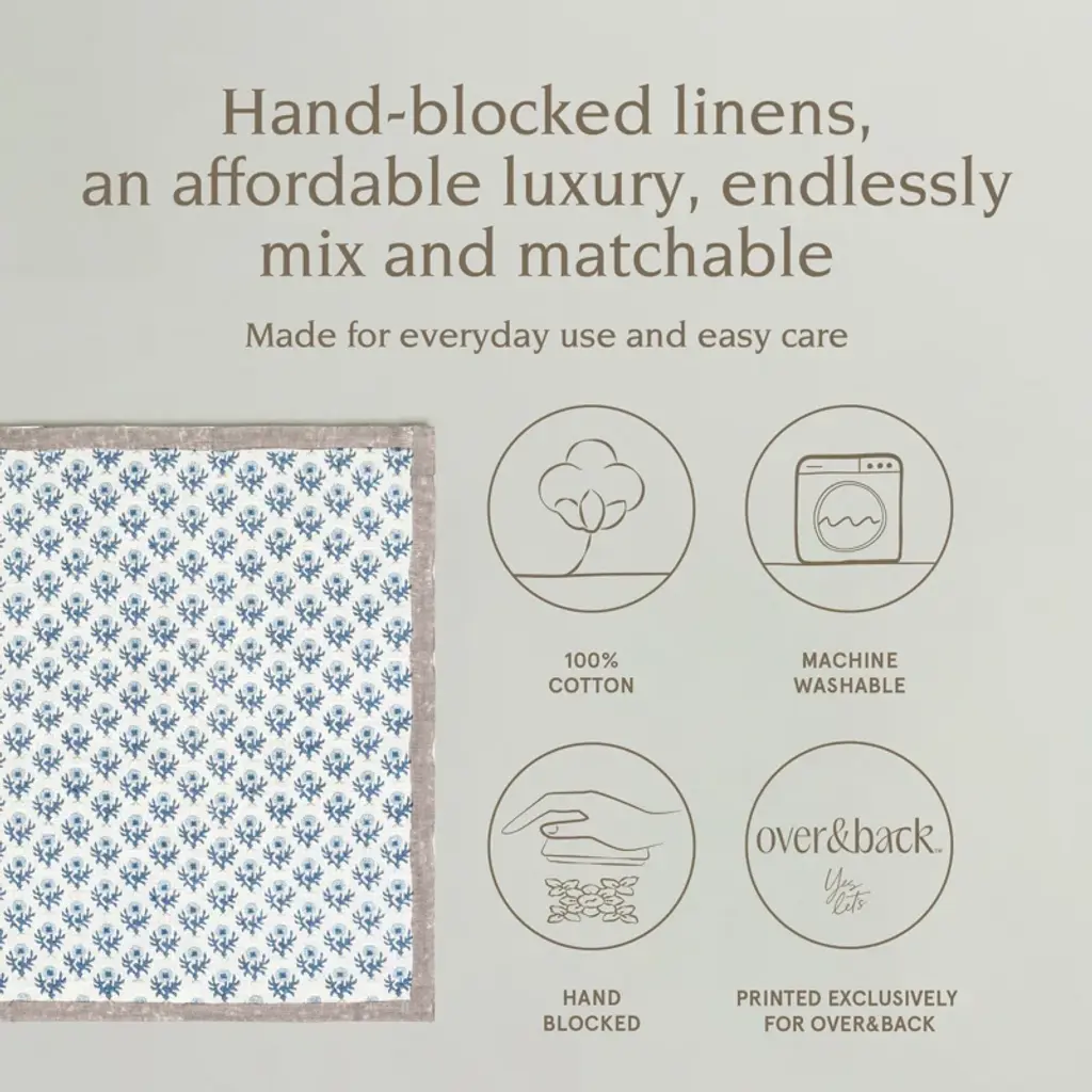 UNIQUE NAPKINS: Our artisans employ a centuries-old process that originated in India, using hand-carved wood blocks to apply each color by hand. Each piece may have subtle variations that make them perfectly unique, adding to their beauty and charm. MIX-AND-MATCH: All our hand-blocked printed napkins use the same color palette to easily blend with all of our collections. Feel free to mix our prints with our woven stripes or even our 100% solid linens to create your own personal style. THE PERFECT GIFT: Advance to next-level gifting with this cloth napkin, perfect for housewarmings, weddings, showers, birthdays, Valentine's Day, Thanksgiving, Christmas, New Year's, Easter, and more. The giftees will be forever grateful, and you'll solidify your reputation as the Best Gift-Giver Ever. EASY CARE: Treat them right, and our washable napkins will last for years to come. Machine wash and tumble dry low. OVER&BACK: We make setting the table less of a task and more of a daily delight with beautiful, well-made pieces anyone can effortlessly mix-and-match. Check out our brand store for Tablescape Ideas with our curated collections across table linens, glassware, flatware, decorative accessories, dinnerware, and serveware.