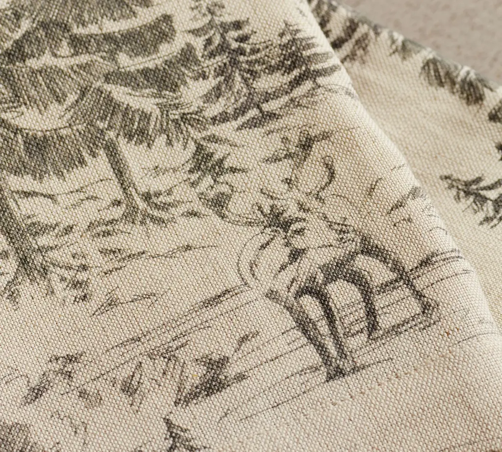 This motif has us craving a stay in a snow-covered cabin. We love the rustic palette – a beautiful balance of washed black on a flax backdrop. Embroidered for a homespun feel.