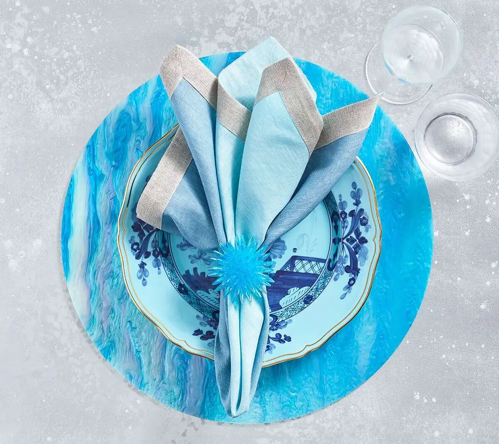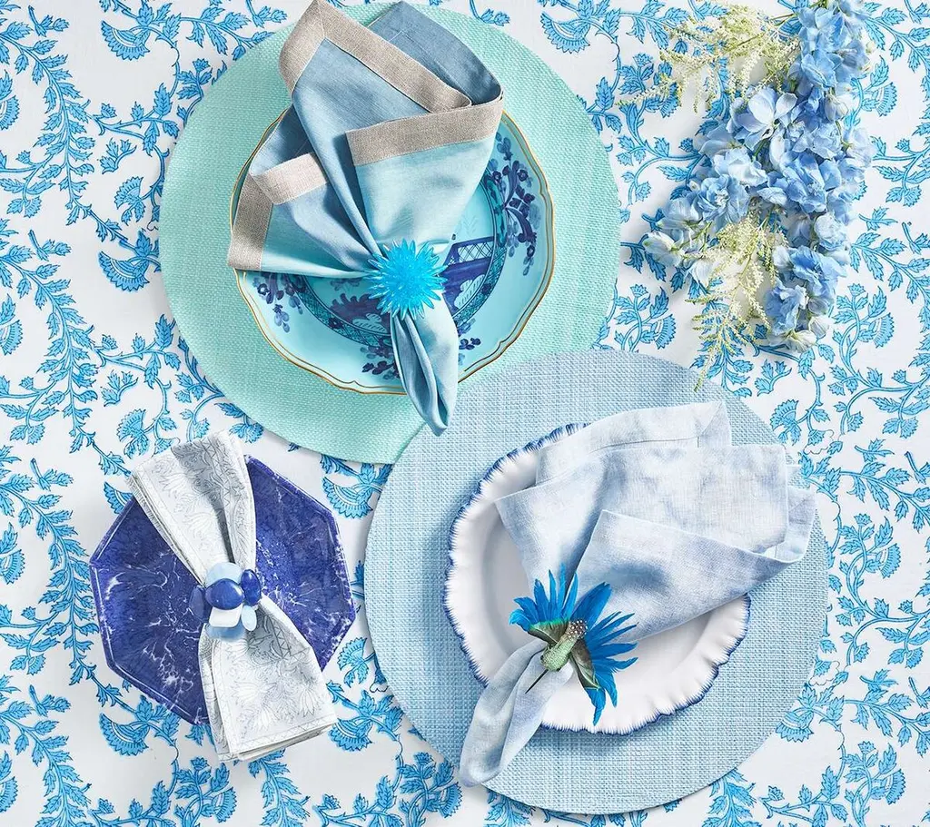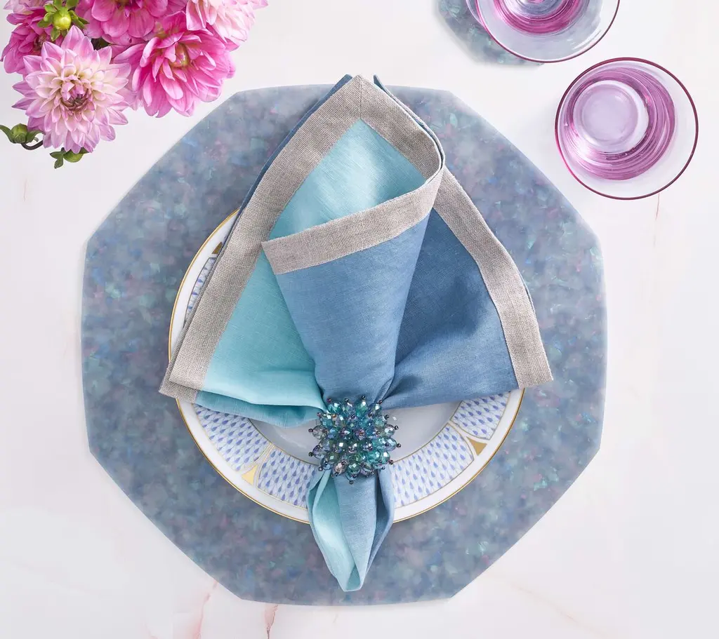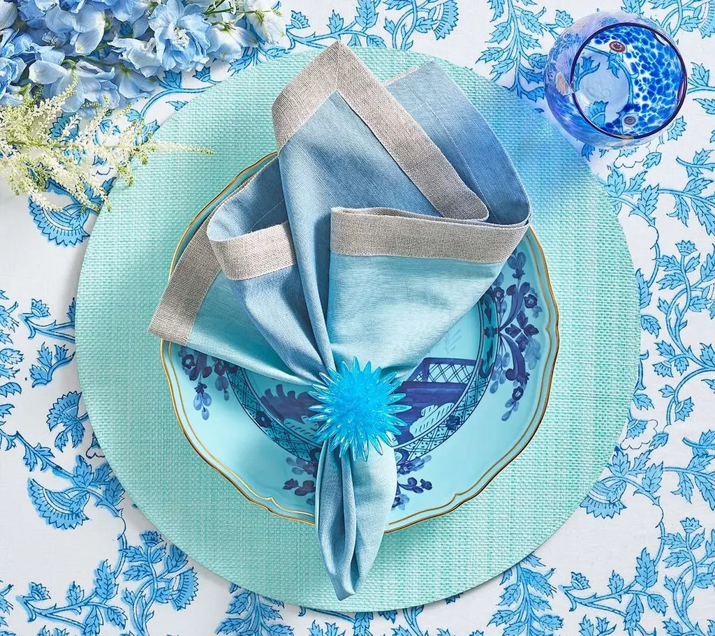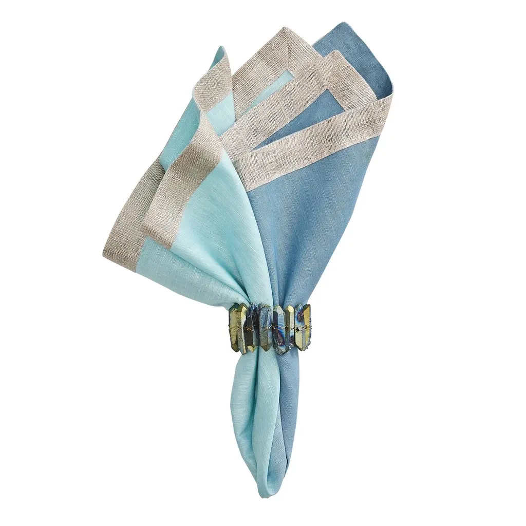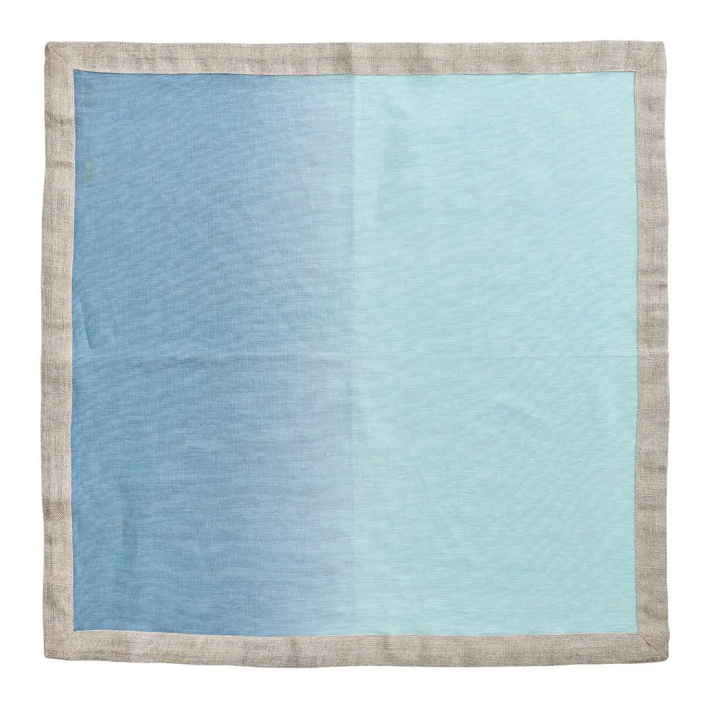 The Dip Dye Napkin features an ombre gradation, adding a subtle elegance to the refined napkin. This gorgeous color combination complements any table setting. These napkins are hand-dipped and dyed and accented with a luxurious metallic foil border. Each is hand-crafted by the finest artisans, with variations in density and depth of color to be expected.