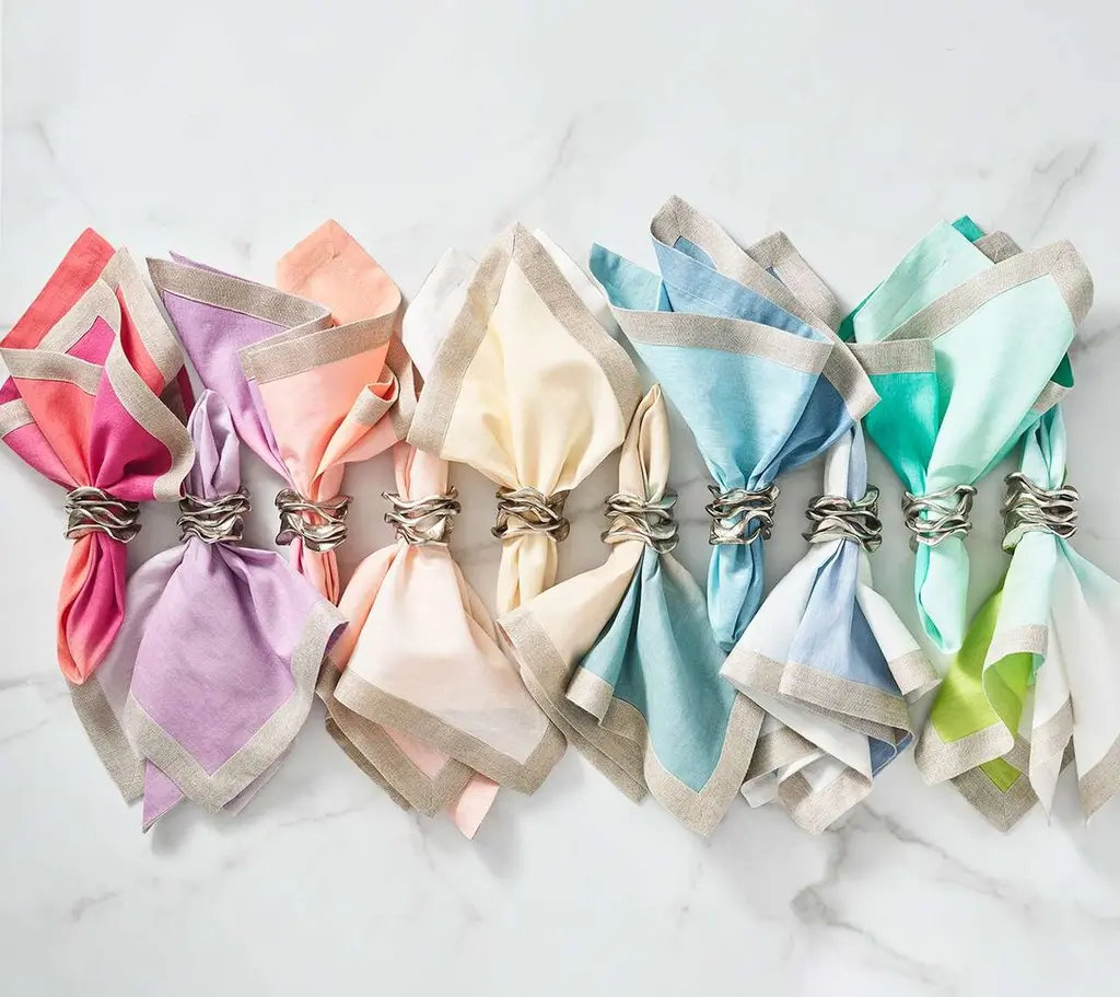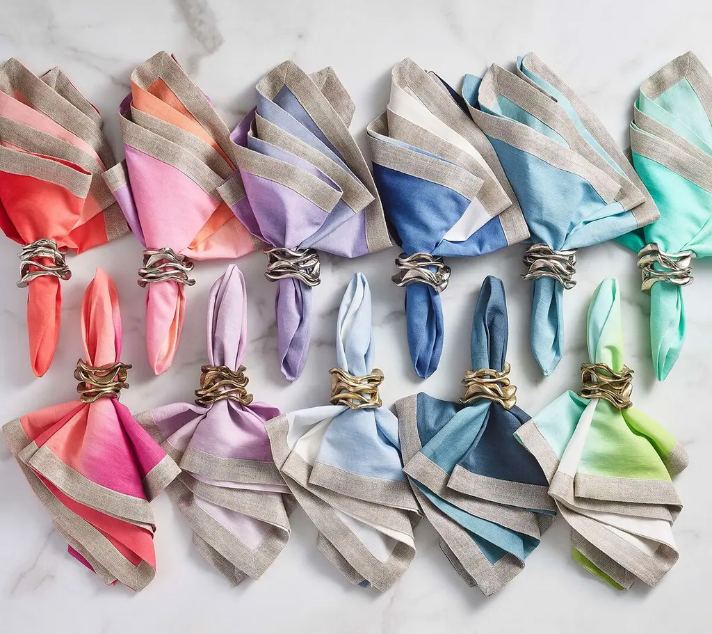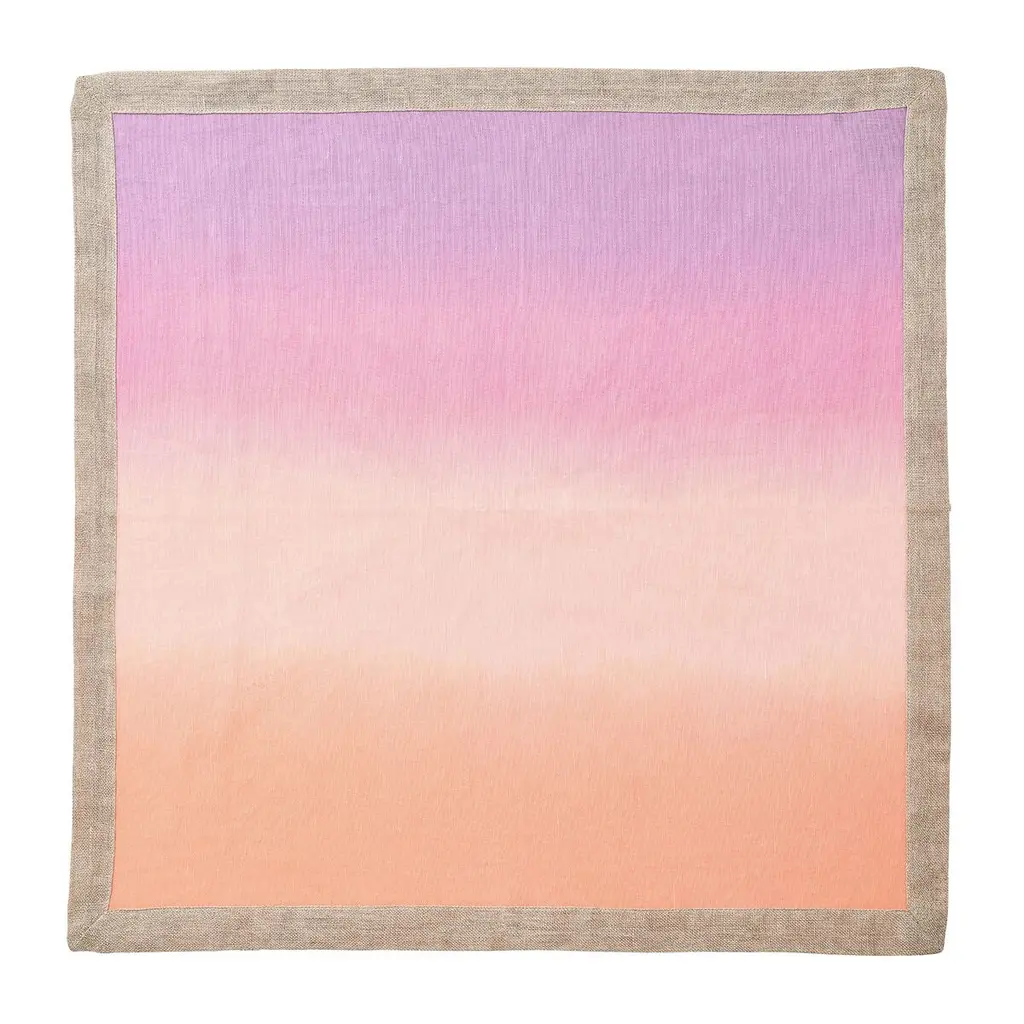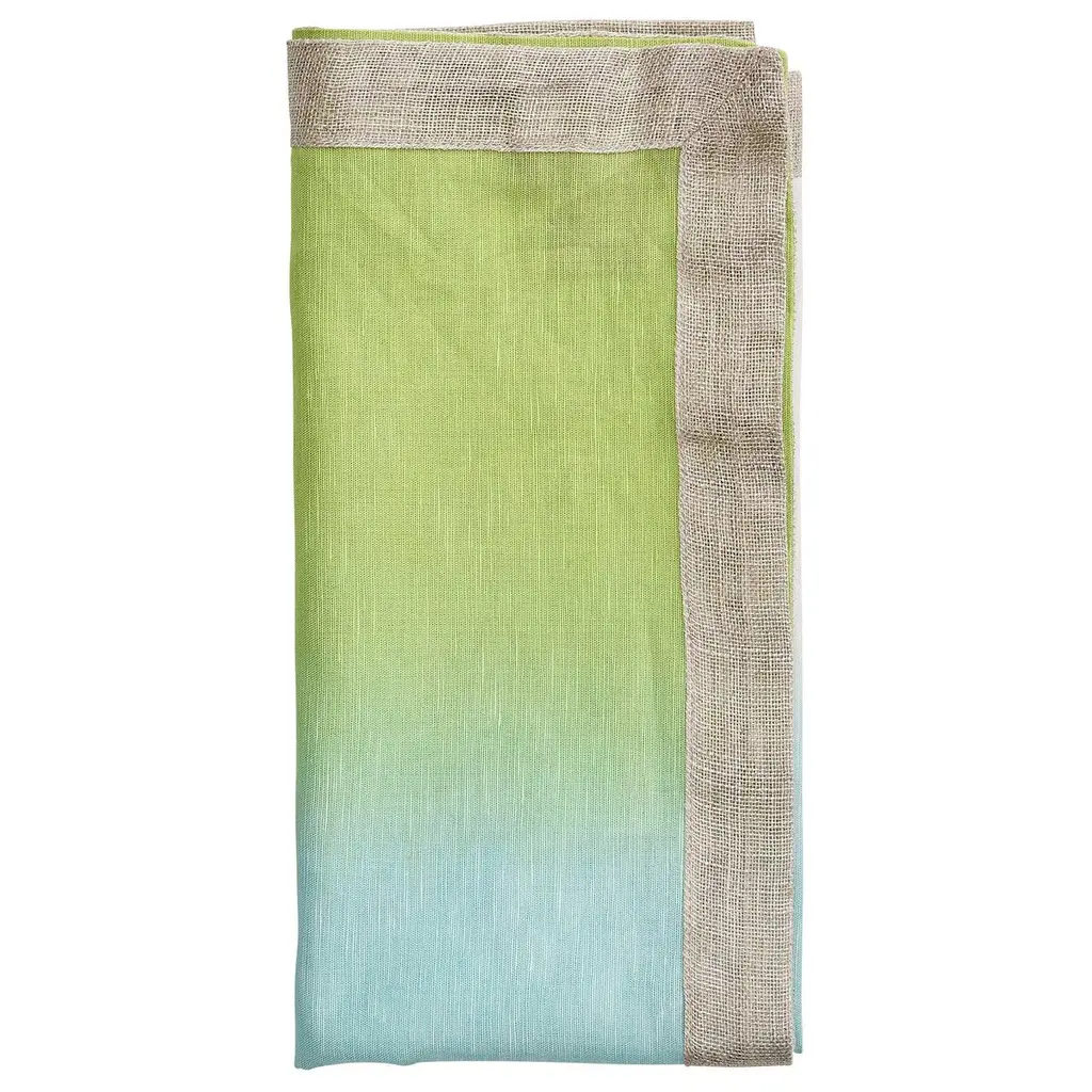 The Dip Dye Napkin features an ombre gradation, adding a subtle elegance to the refined napkin. This gorgeous color combination complements any table setting. These napkins are hand-dipped and dyed and accented with a luxurious metallic foil border. Each is hand-crafted by the finest artisans, with variations in density and depth of color to be expected.