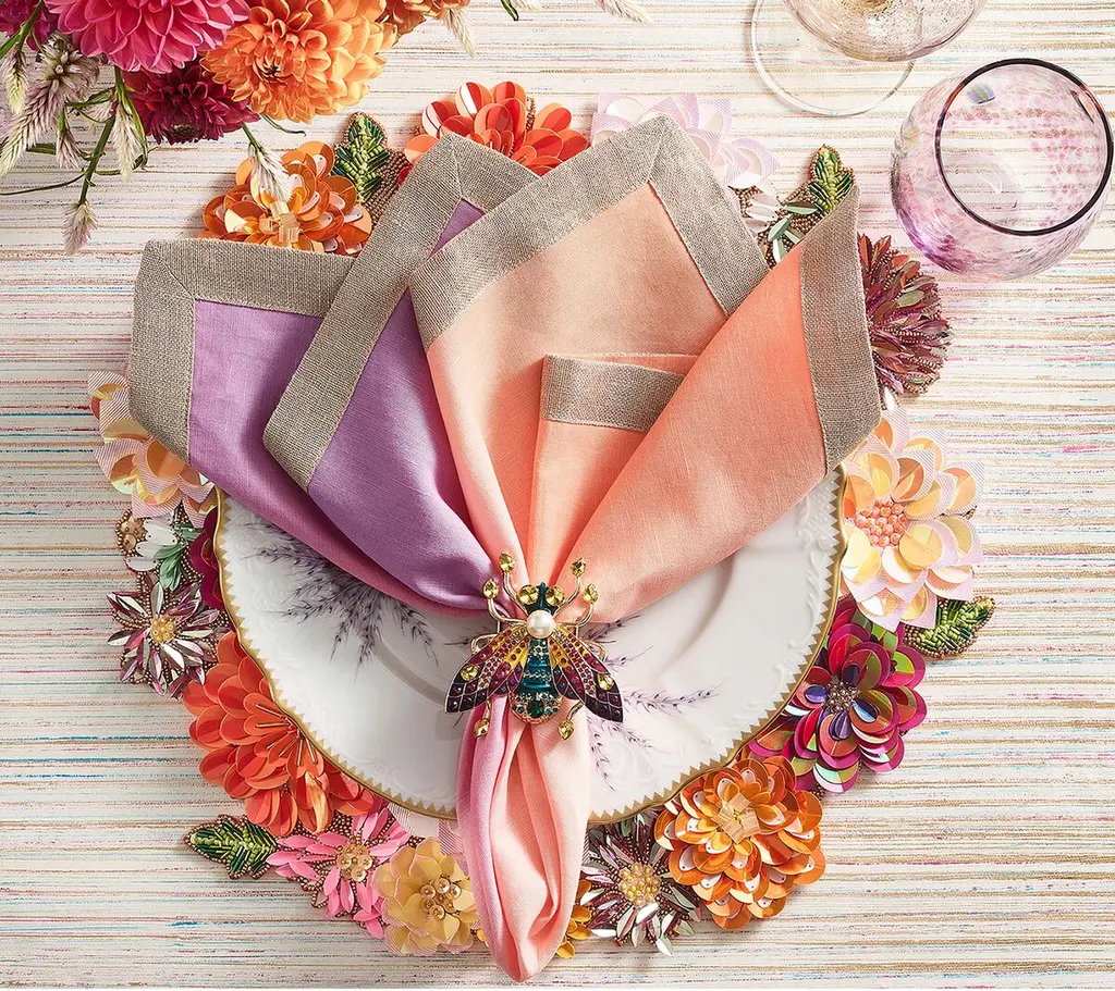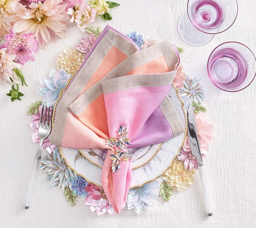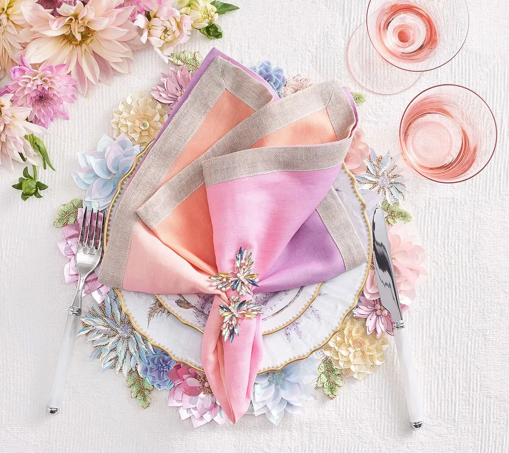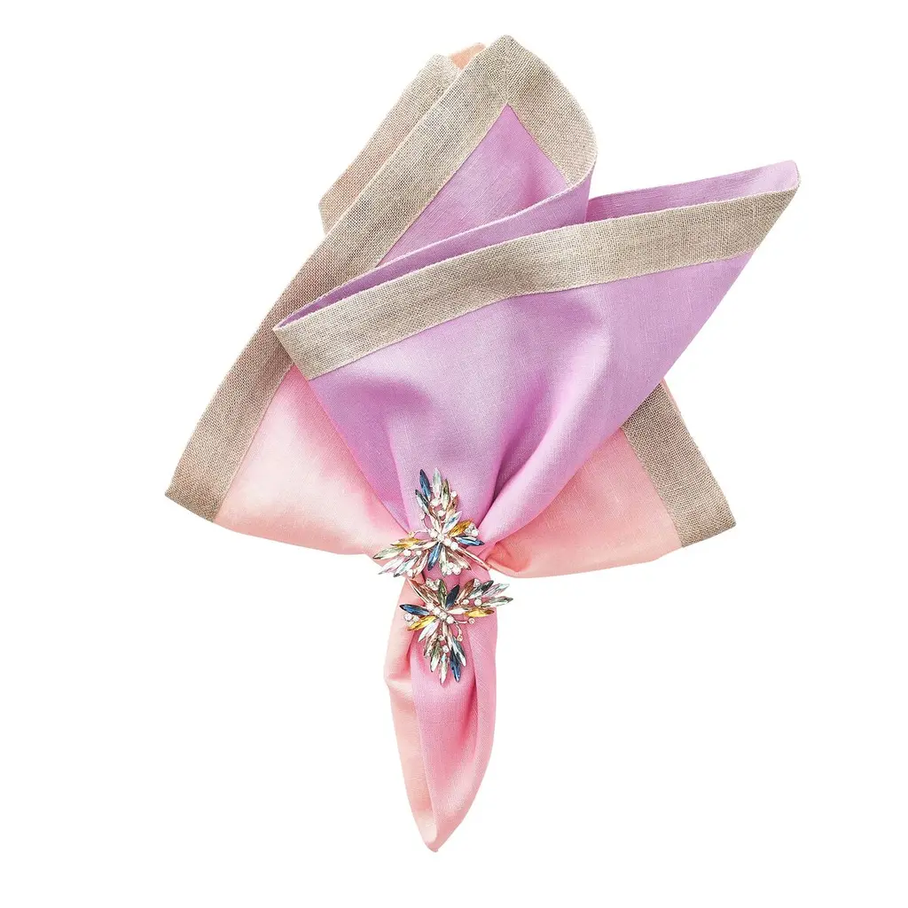 The Dip Dye Napkin features an ombre gradation, adding a subtle elegance to the refined napkin. This gorgeous color combination complements any table setting. These napkins are hand-dipped and dyed and accented with a luxurious metallic foil border. Each is hand-crafted by the finest artisans, with variations in density and depth of color to be expected.