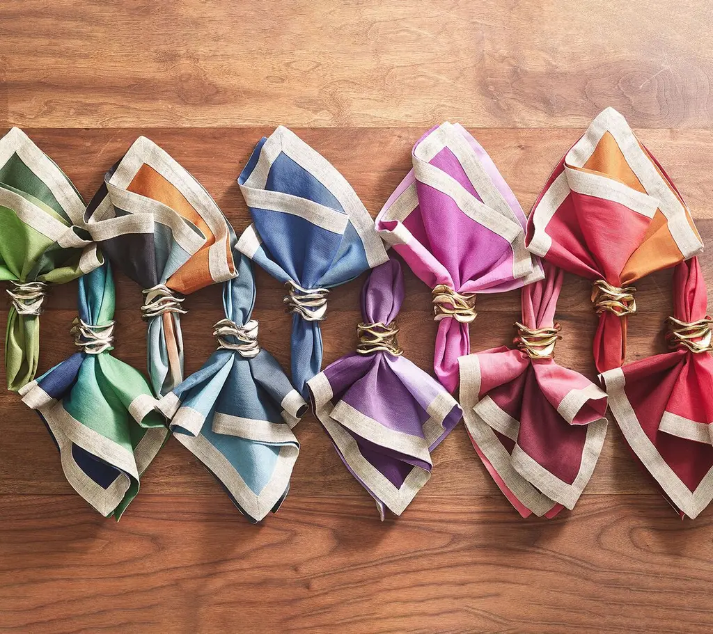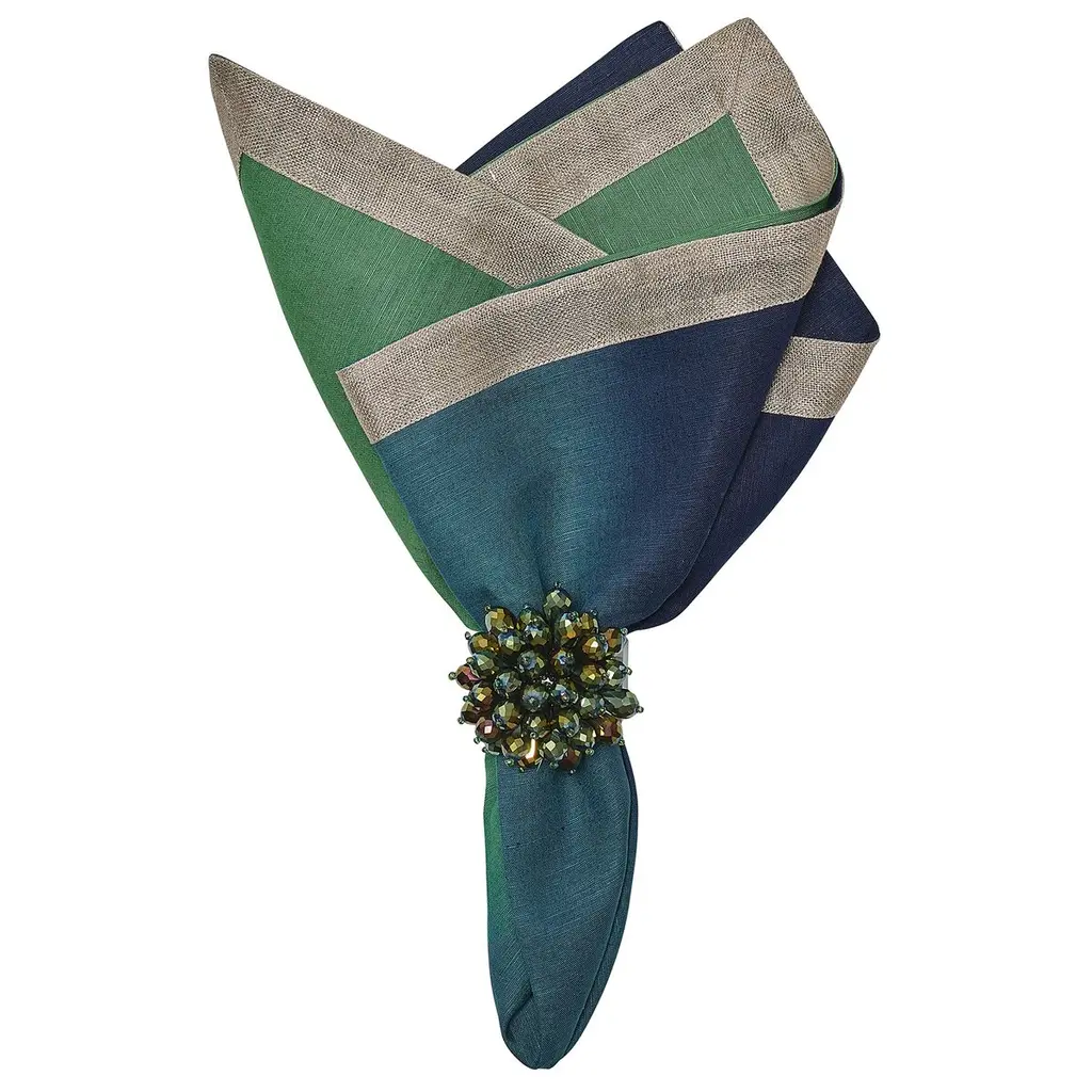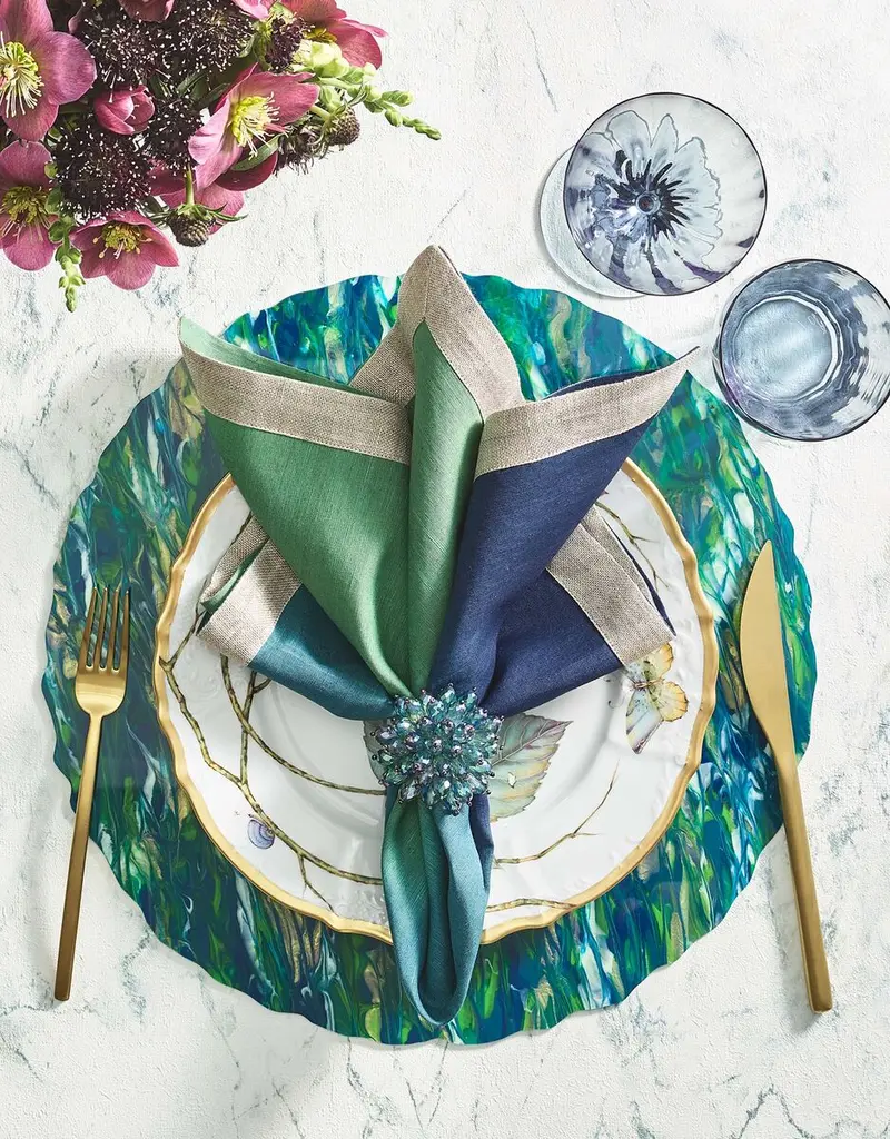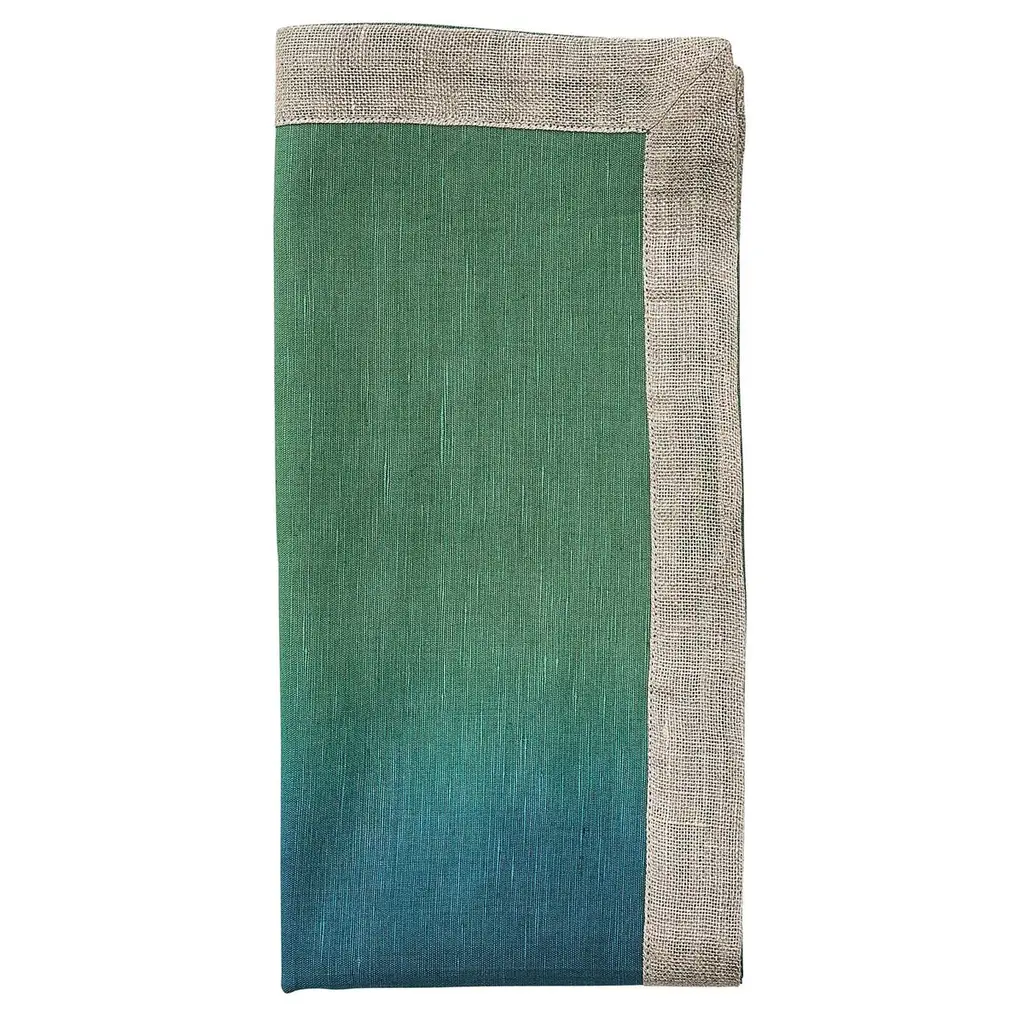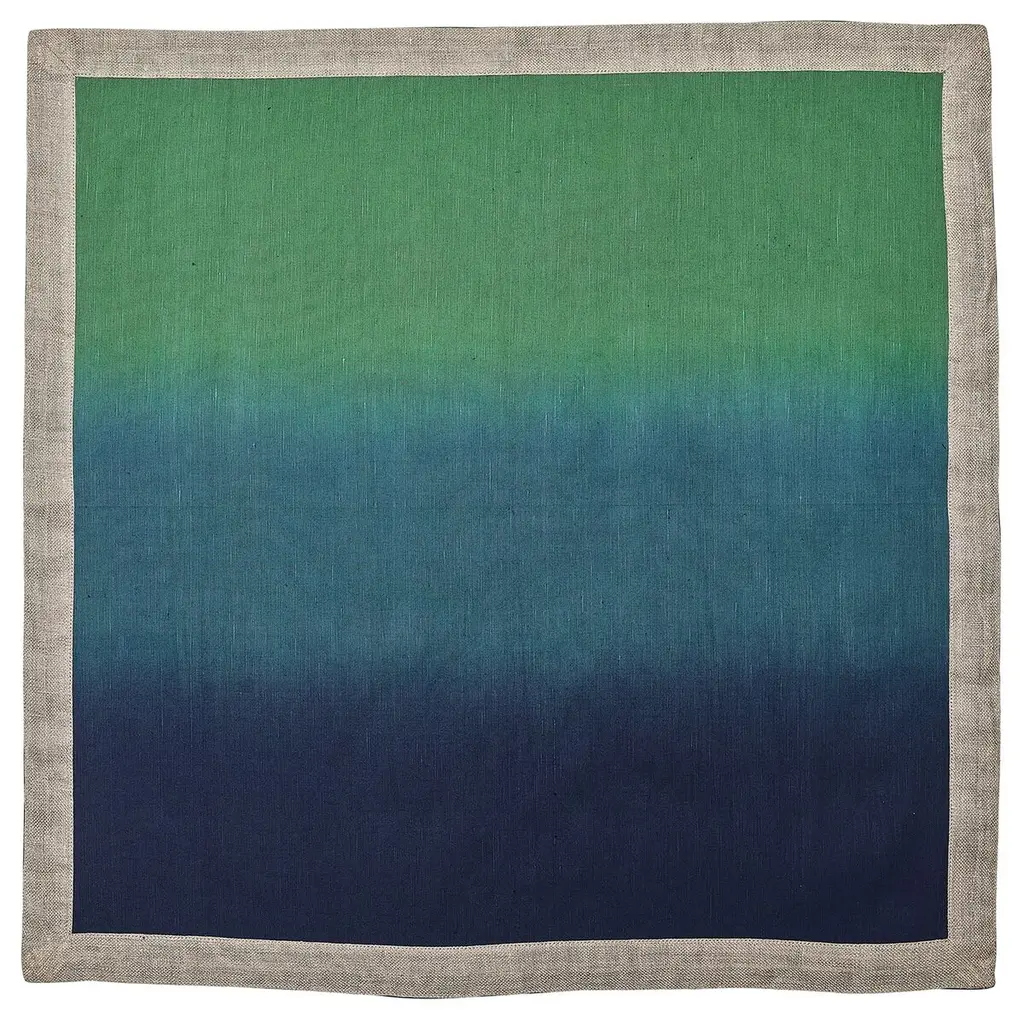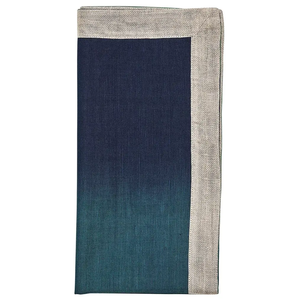 The Dip Dye Napkin features an ombre gradation, adding a subtle elegance to the refined napkin. This gorgeous color combination complements any table setting. These napkins are hand-dipped and dyed and accented with a luxurious metallic foil border. Each is hand-crafted by the finest artisans, with variations in density and depth of color to be expected.