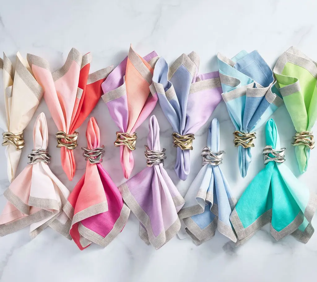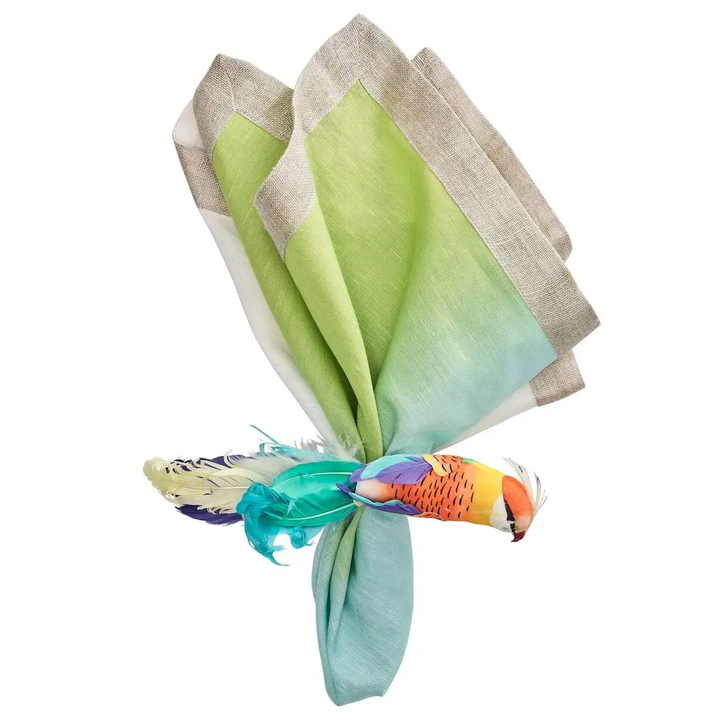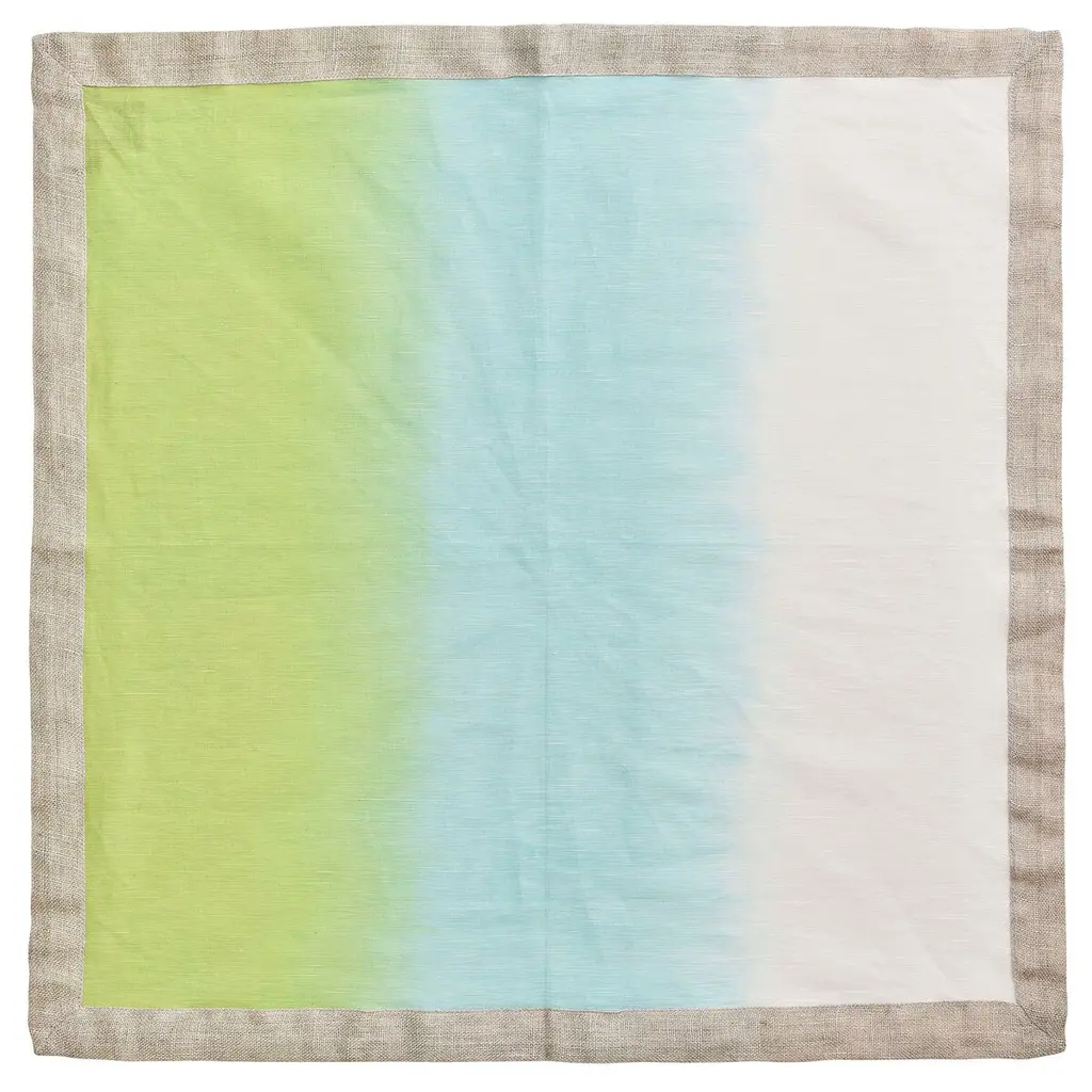 The Dip Dye Napkin features an ombre gradation, adding a subtle elegance to the refined napkin. This gorgeous color combination complements any table setting. These napkins are hand-dipped and dyed and accented with a luxurious metallic foil border. Each is hand-crafted by the finest artisans, with variations in density and depth of color to be expected.